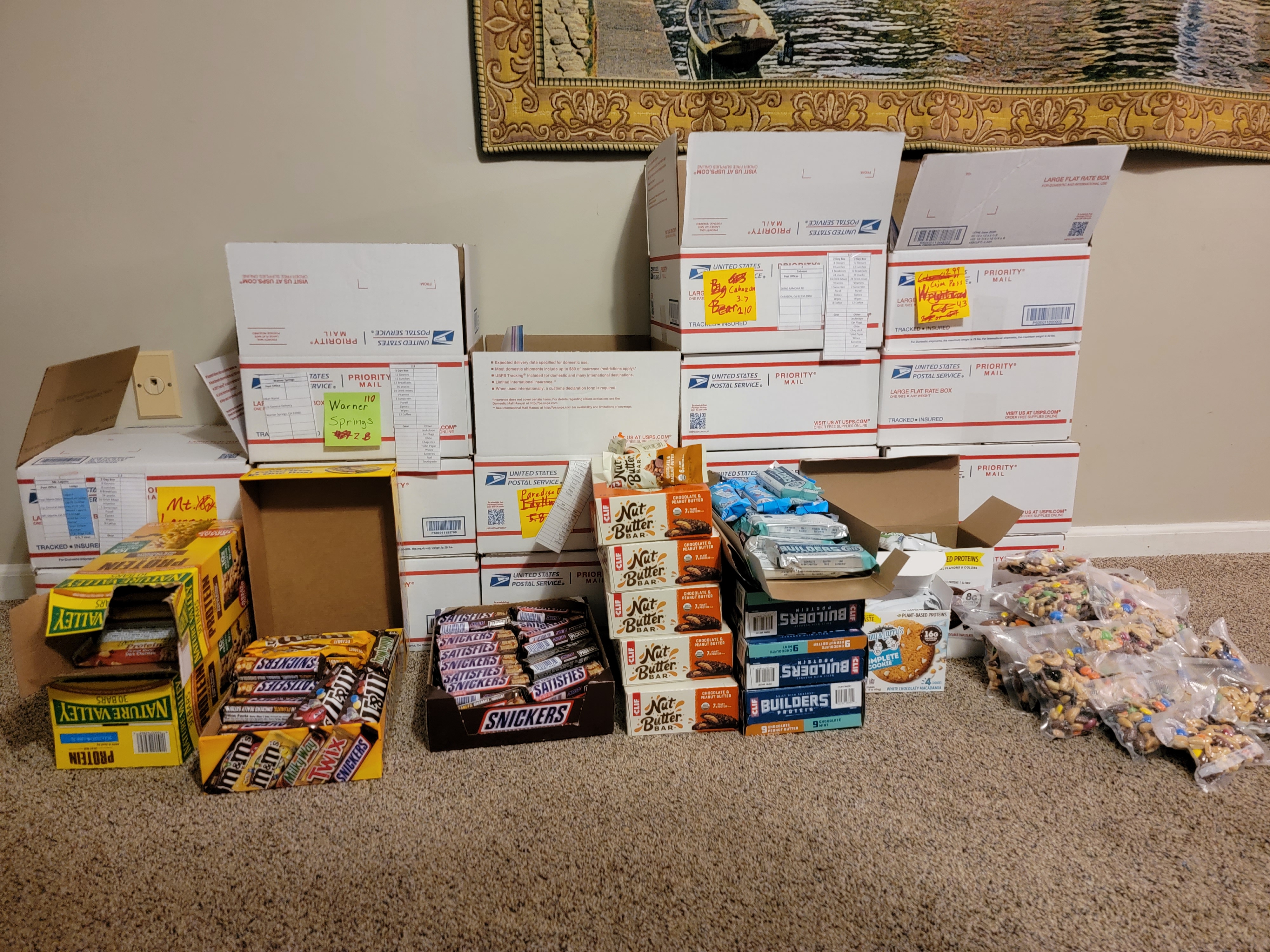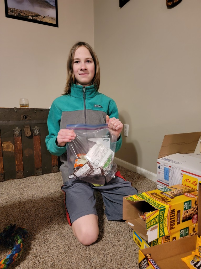 This evening we organized our snacks for the first 5 locations we are sending boxes. There is a mix of candy bars, protein bars, and trail mix. The kids helped pick out their snacks and now we only have breakfast, lunch, dinner, and toiletries left….and 6 more full resupplies we’ve barely started.