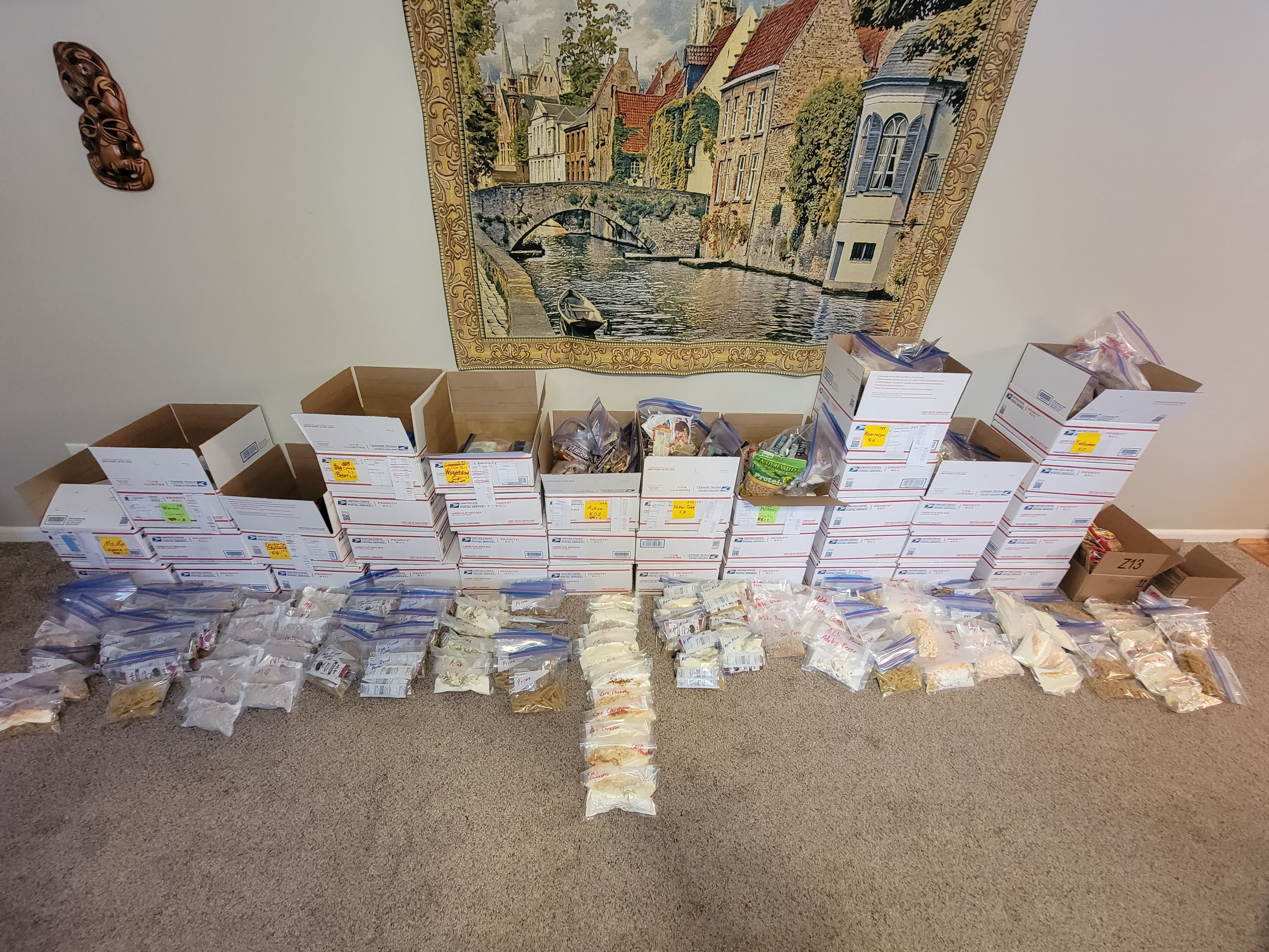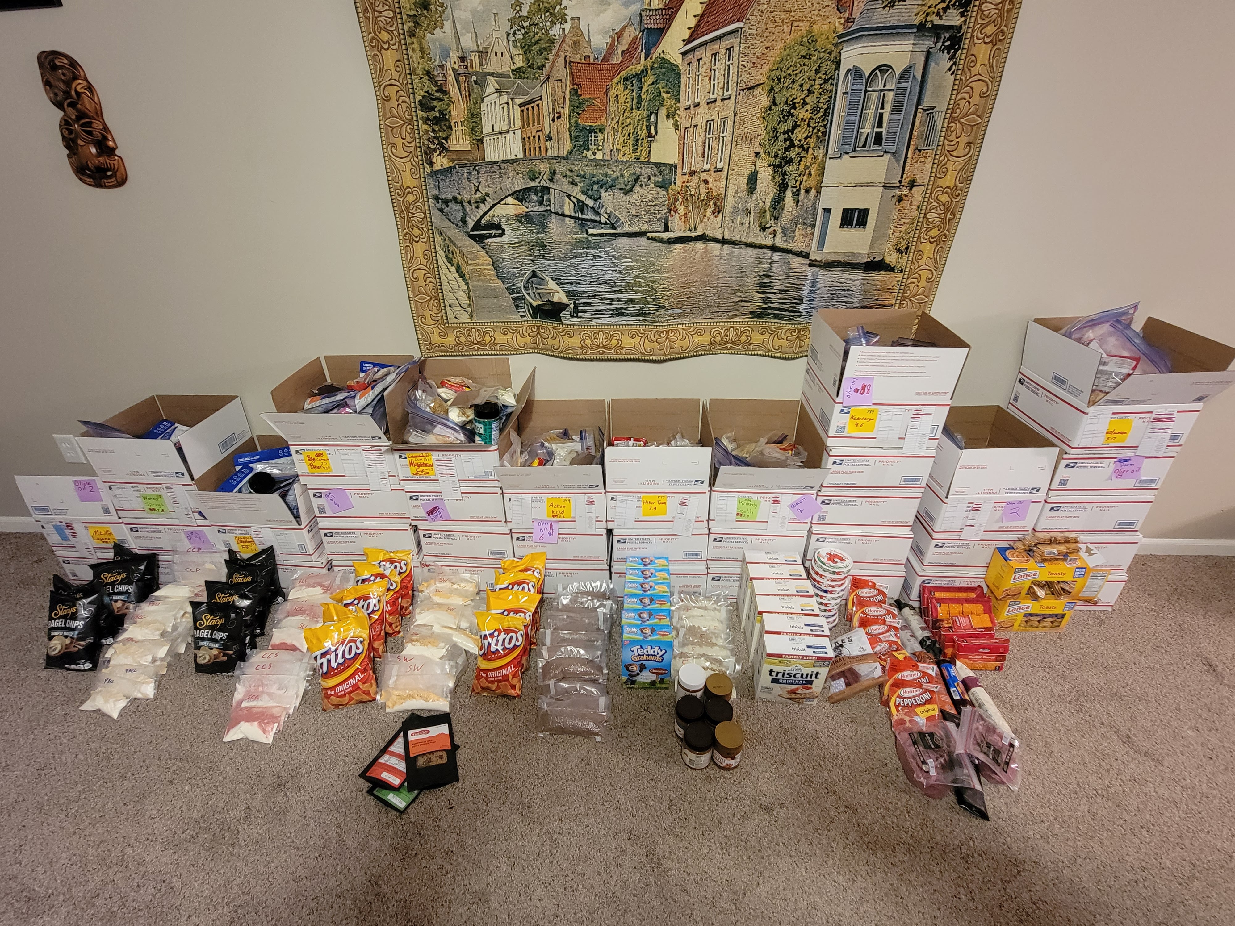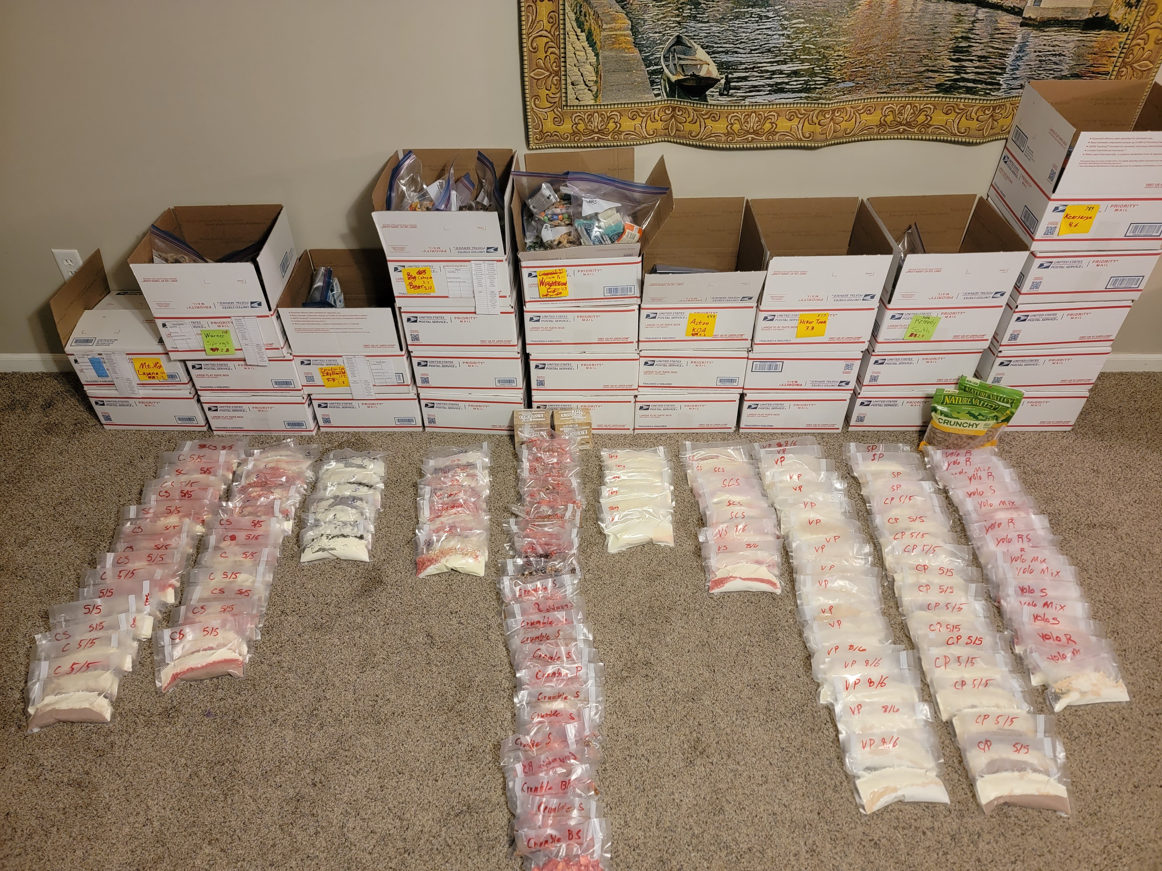 We wrapped up meal prep last week and moved on to packing the resupply boxes. We split the packing over a few days (1 for each meal) to keep it from feeling like a chore. We have a few odds and ends to wrap up, but this closes out what has been by far the largest part of trip prep. A few of the stacks of boxes will be shipping out in the next week, and the remainder will be headed to friends who will be shipping them to us as we go. Now that the meals are behind us it’s time to organize gear.