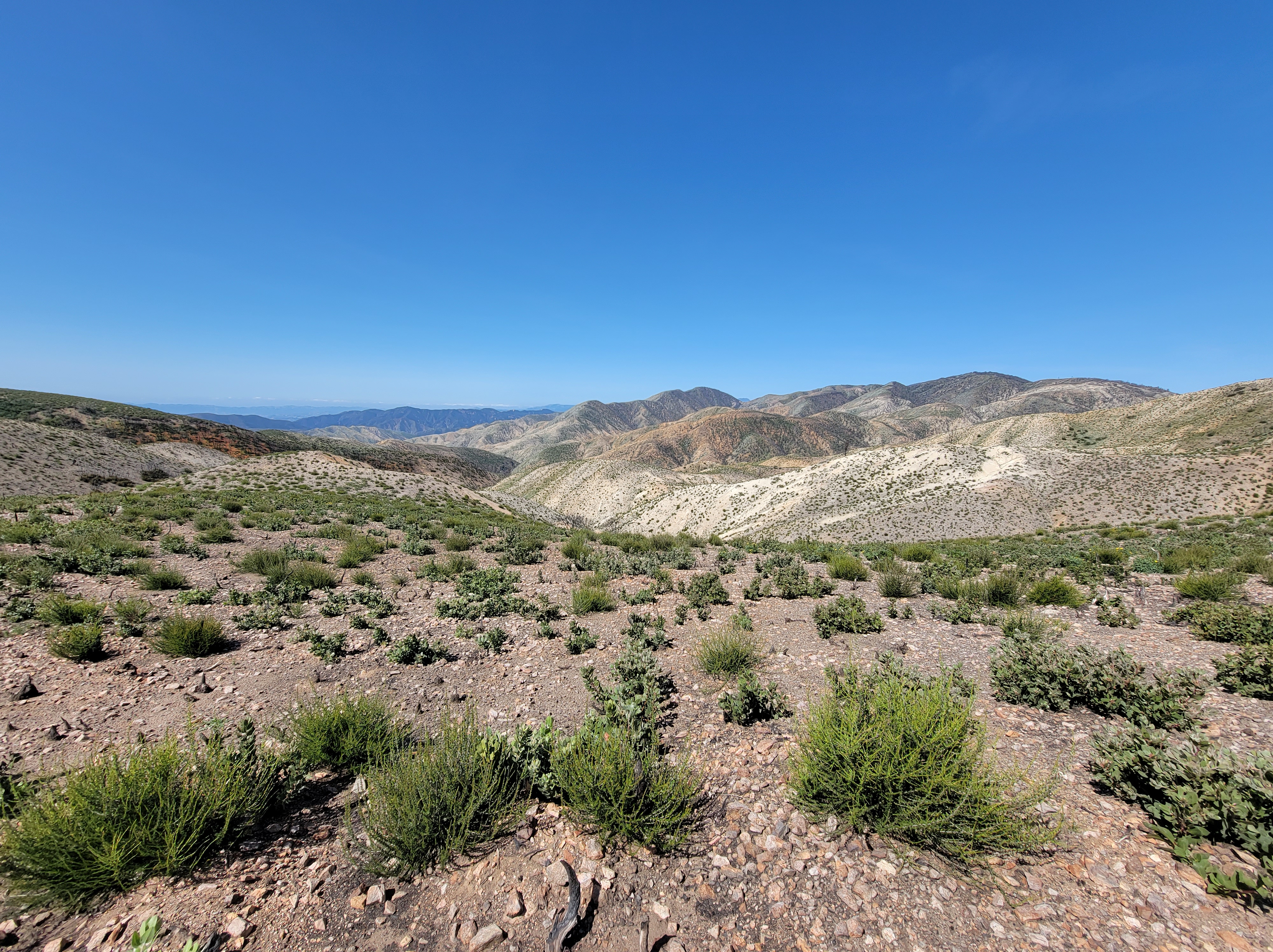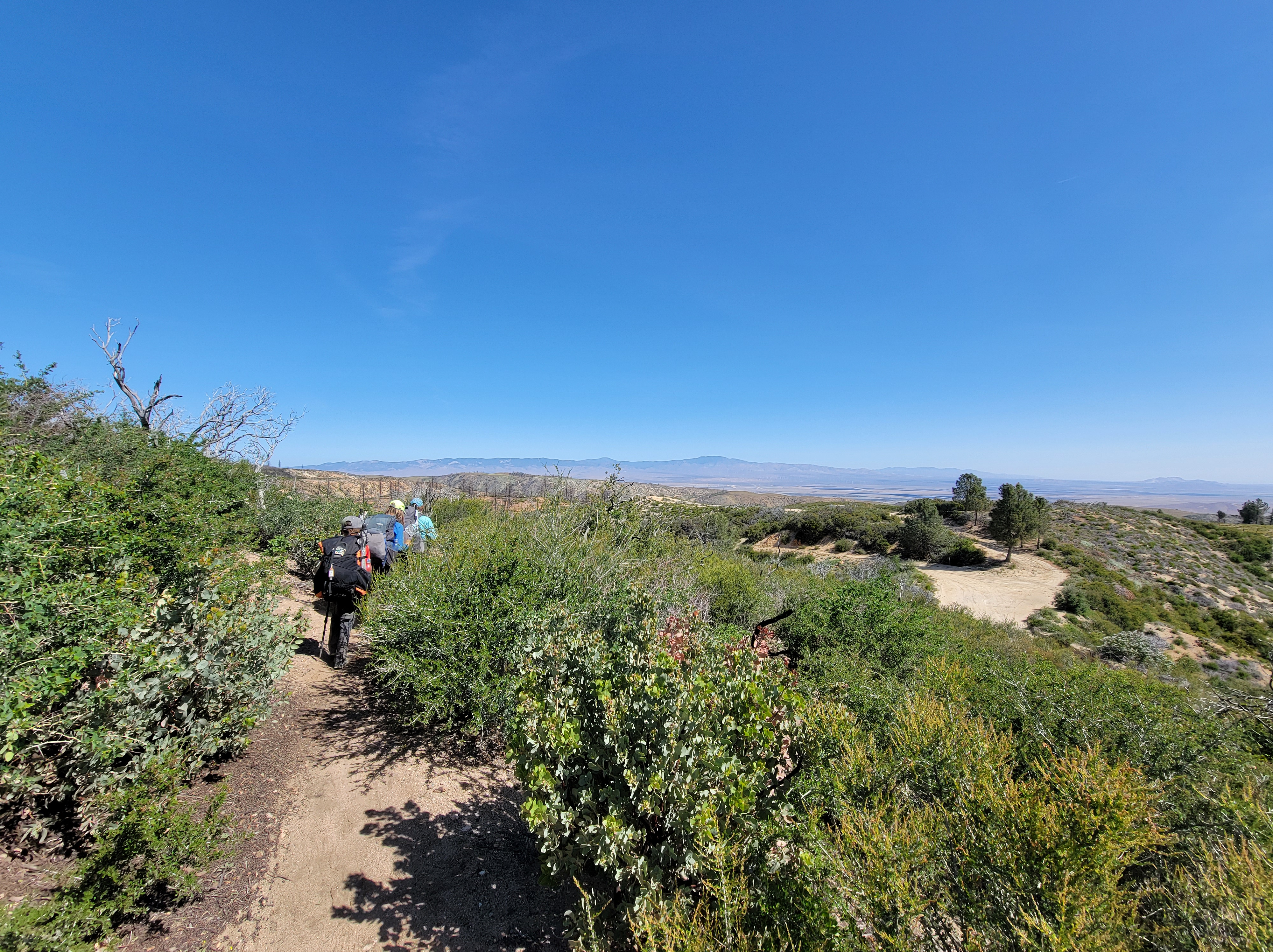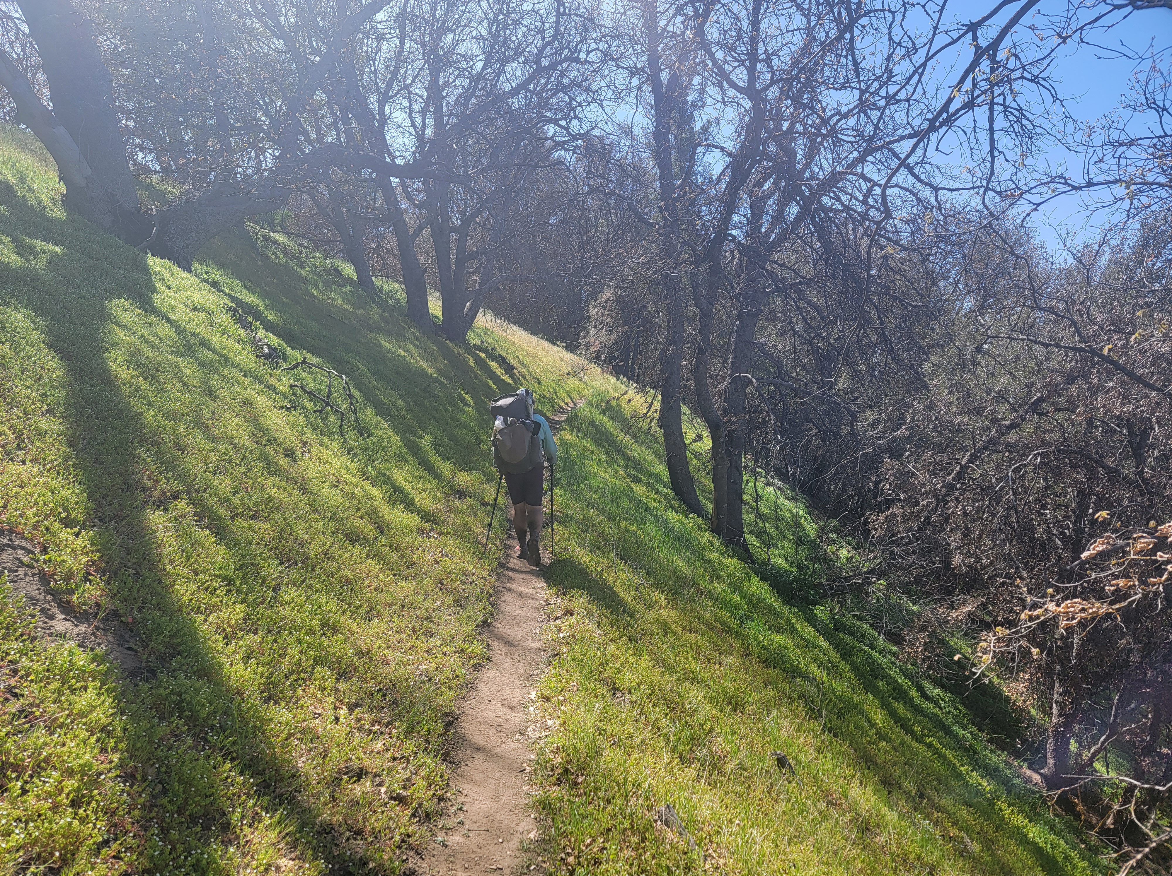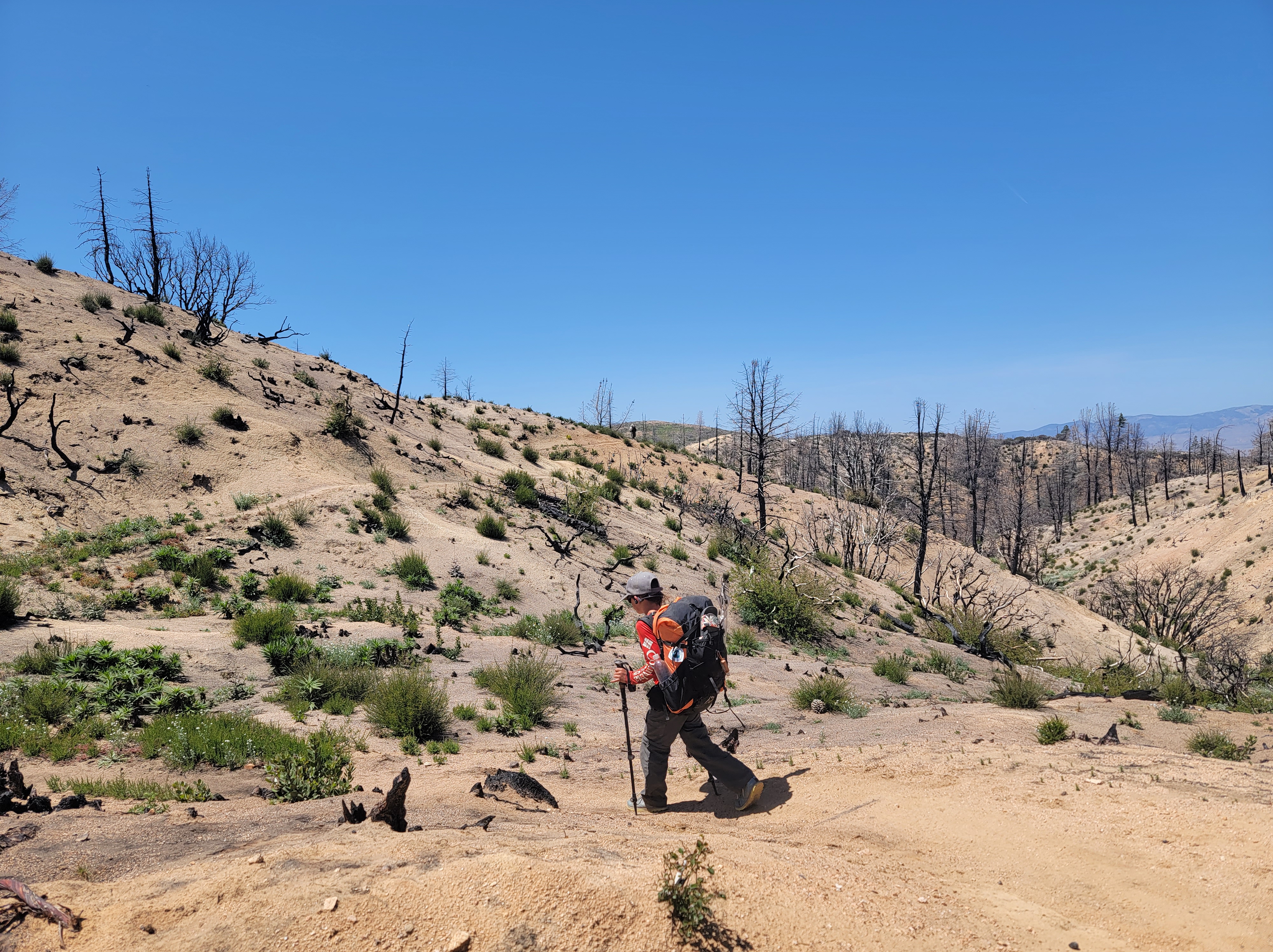 Back on trail we left the trees and entered a burn which we’d be in for the next few miles. There were no decent stopping spots for lunch so we ended up on a hillside, barren except for the charred remains of some small trees. Not too long after lunch the trail turned a corner into a depressing site of hundreds of burnt, dead, and felled pines which once would have been a beautiful shady forest.