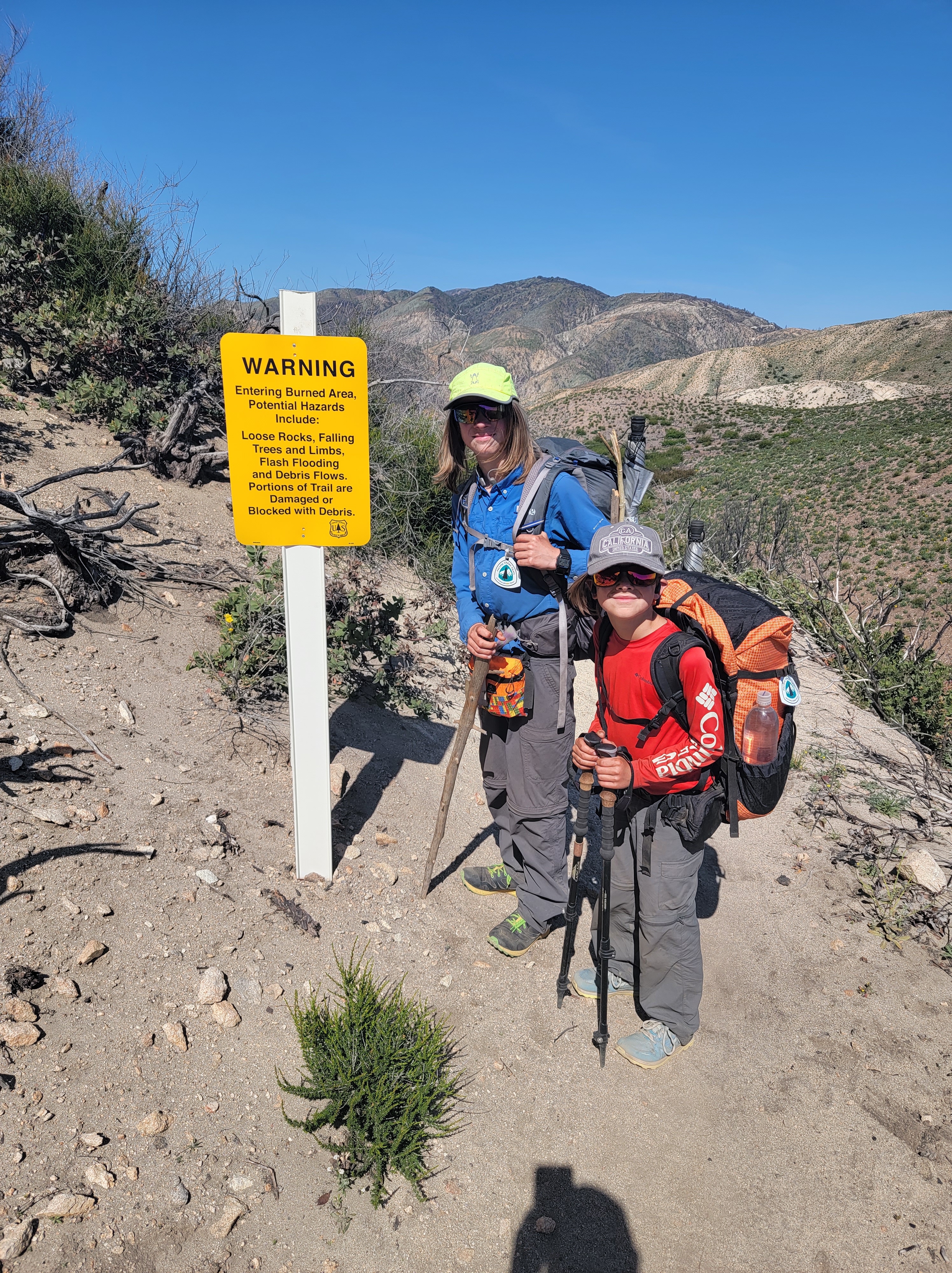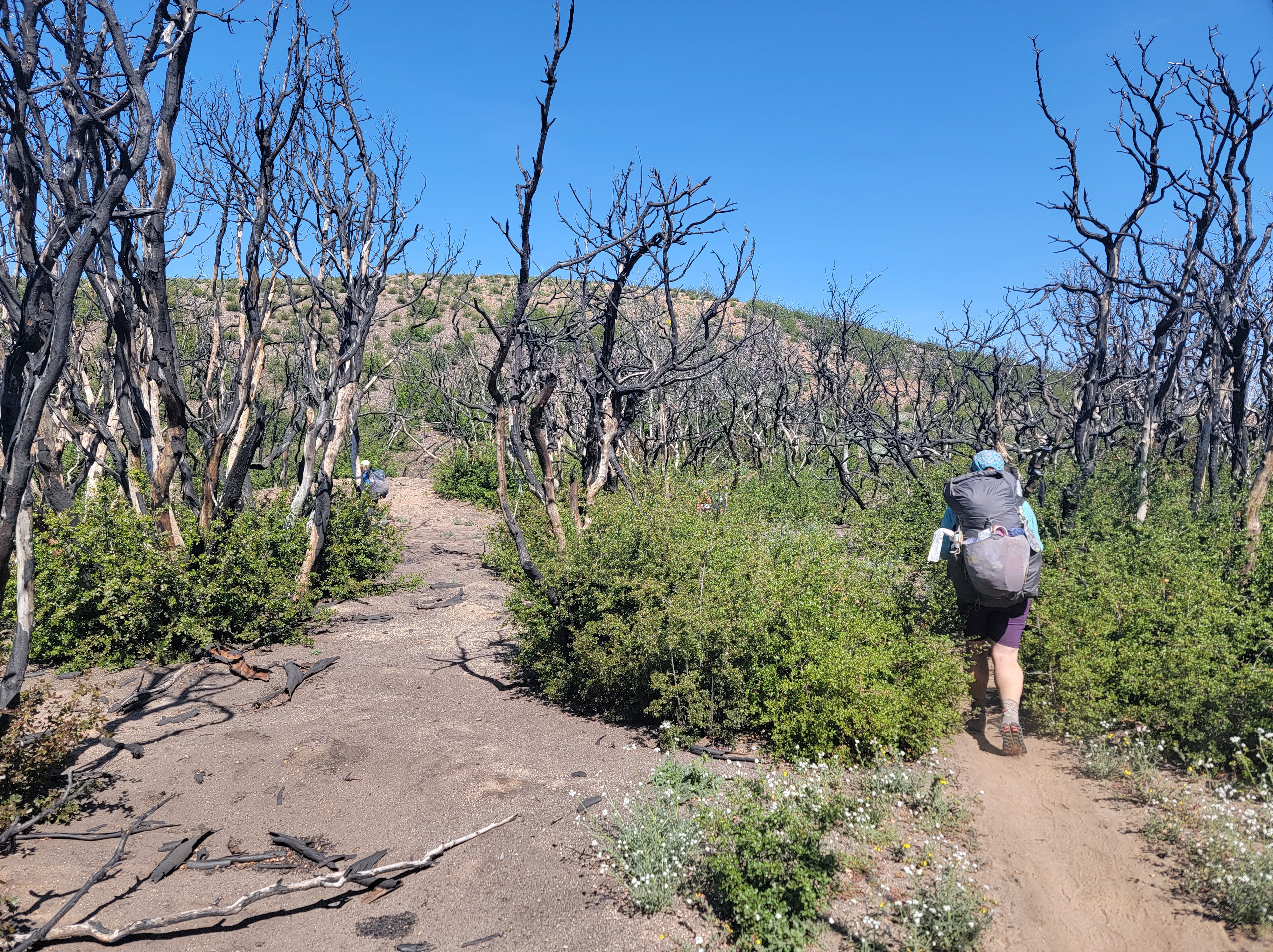 Today was a mix of scenery ranging from desert mountains to a burn to a lovely forest. We woke early as usual and hit the trail with General before it had a chance to warm up. The trail went up almost immediately, taxing heavy legs from the day before. We met up with General relaxing in the shade of a few trees. We quickly joined him. He seems to have a knack for finding the best break spots.