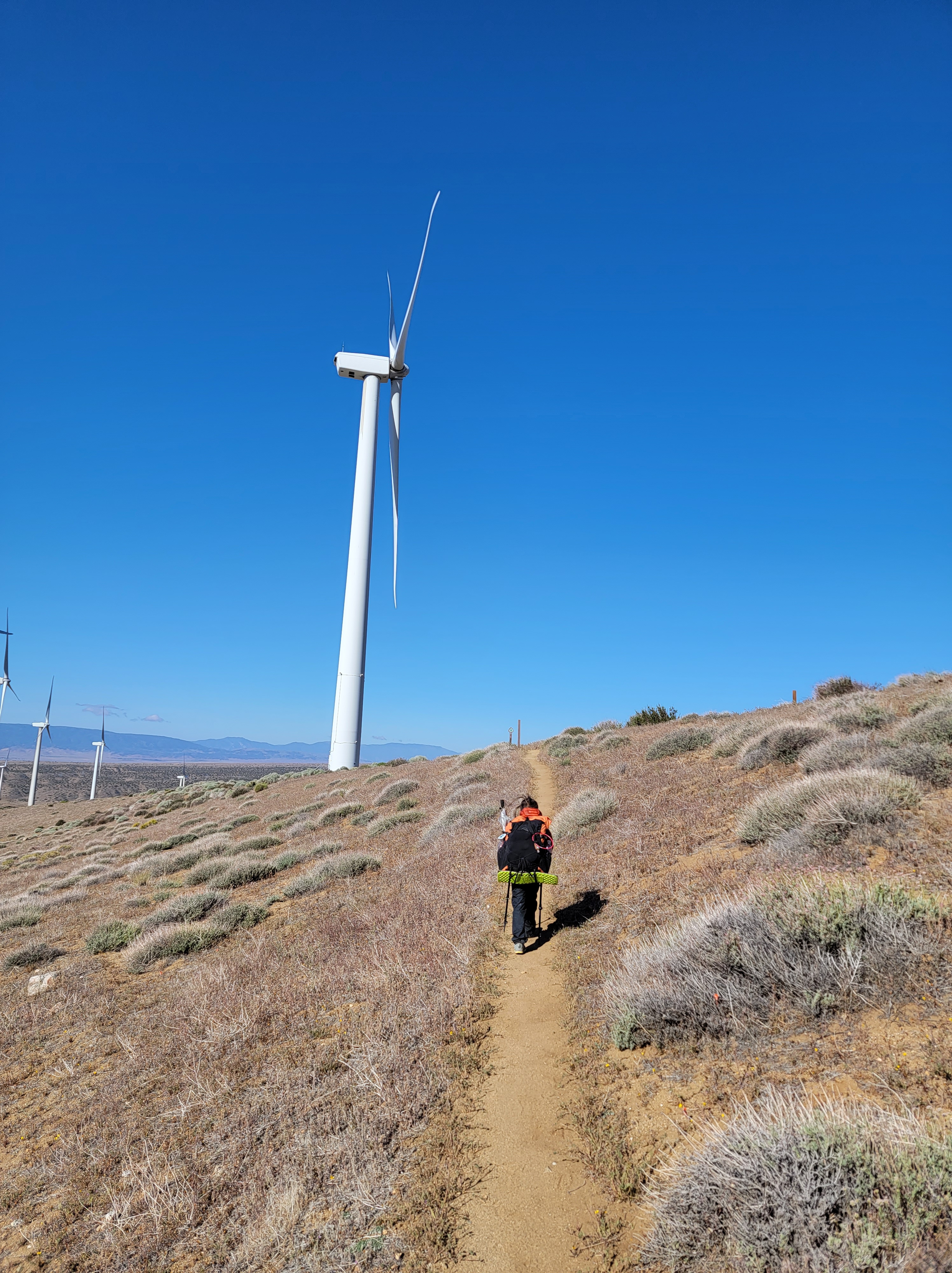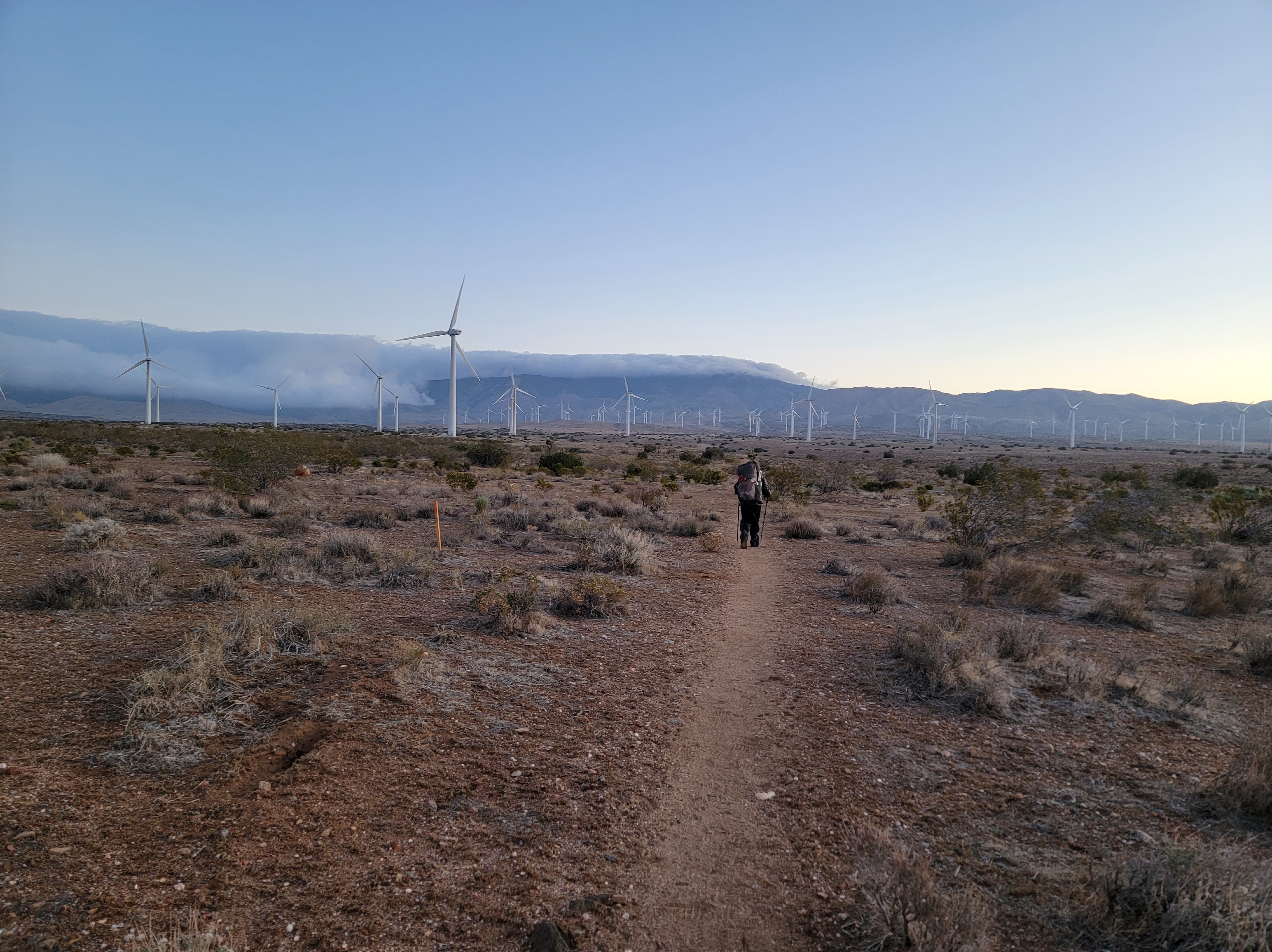 So we thought we’d hiked through some serious wind before…we were so wrong.  From the minute we left camp until the next morning we were almost continuously blasted by wind.  We left camp early, quickly climbing out of our sheltered valley and into what was likely a 50mph head wind for the next few miles.  It was also probably only 40 degrees so it was completely miserable.  We spend two short breaks hiding behind the few bushes we can find for wind protection.  We eventually make it to the campsites we’d considered getting to last night.  The wind isn’t too terrible now, but  everyone there had a miserable night getting wind blasted.