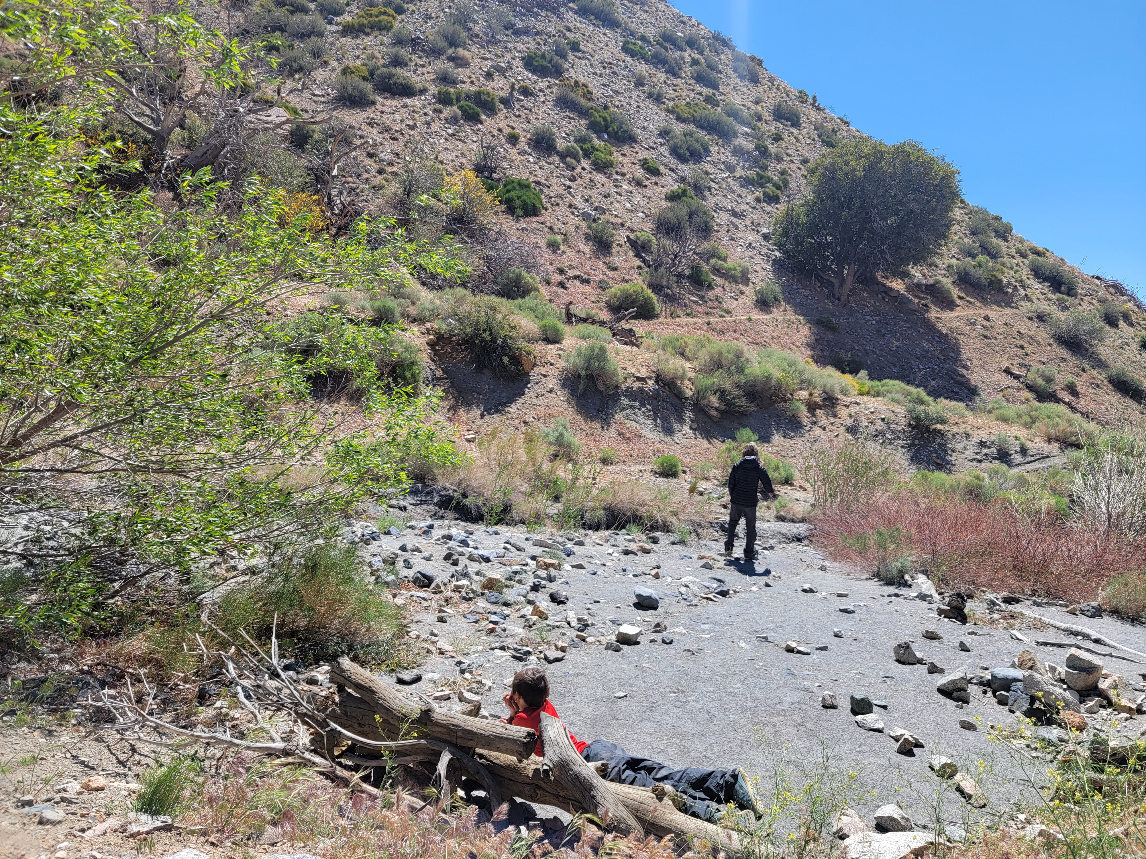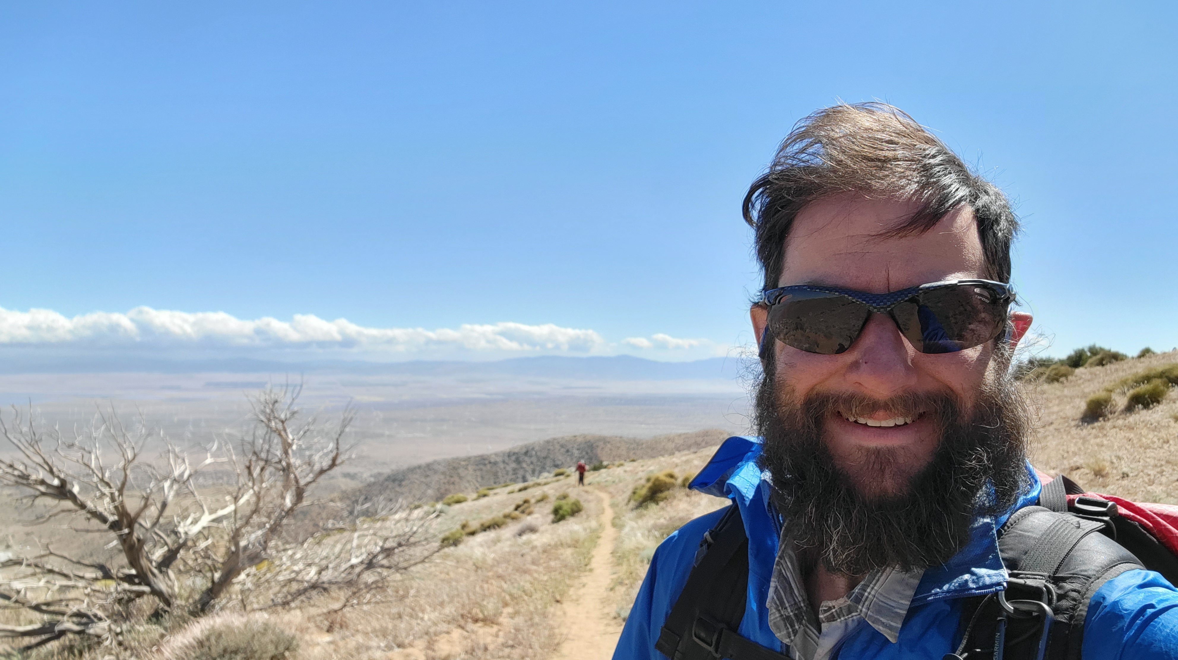 Once back on the trail we realize the morning winds were a mere warm-up.  Winds have picked up and some of the gusts stop us in our tracks while others even slide us backwards through sandy trail.  Some gusts threaten, and succeed, to push us off trail.  Luckily the wind doesn’t seem to be blowing downhill so the risk of being blown off the mountain seems low. The wind gets worse as we continue to climb. We come around one corner which sounds like an airport runway with winds that had to have been blowing at least 60mph.  I now walk close behind Bat Boy as the wind threatens to blow him down a small slope into sagebrush.  A little further on, after the 2nd time I grab him as he gets blown sideways and almost off the trail, I give up on him wearing a pack.  It’s basically a sail on him, and he’s too freaked out to continue the way its going.  I calm him down and then take his pack for the last mile plus to get to camp. Blue Lizard and Rockhopper are further ahead, but are having just as miserable a time.