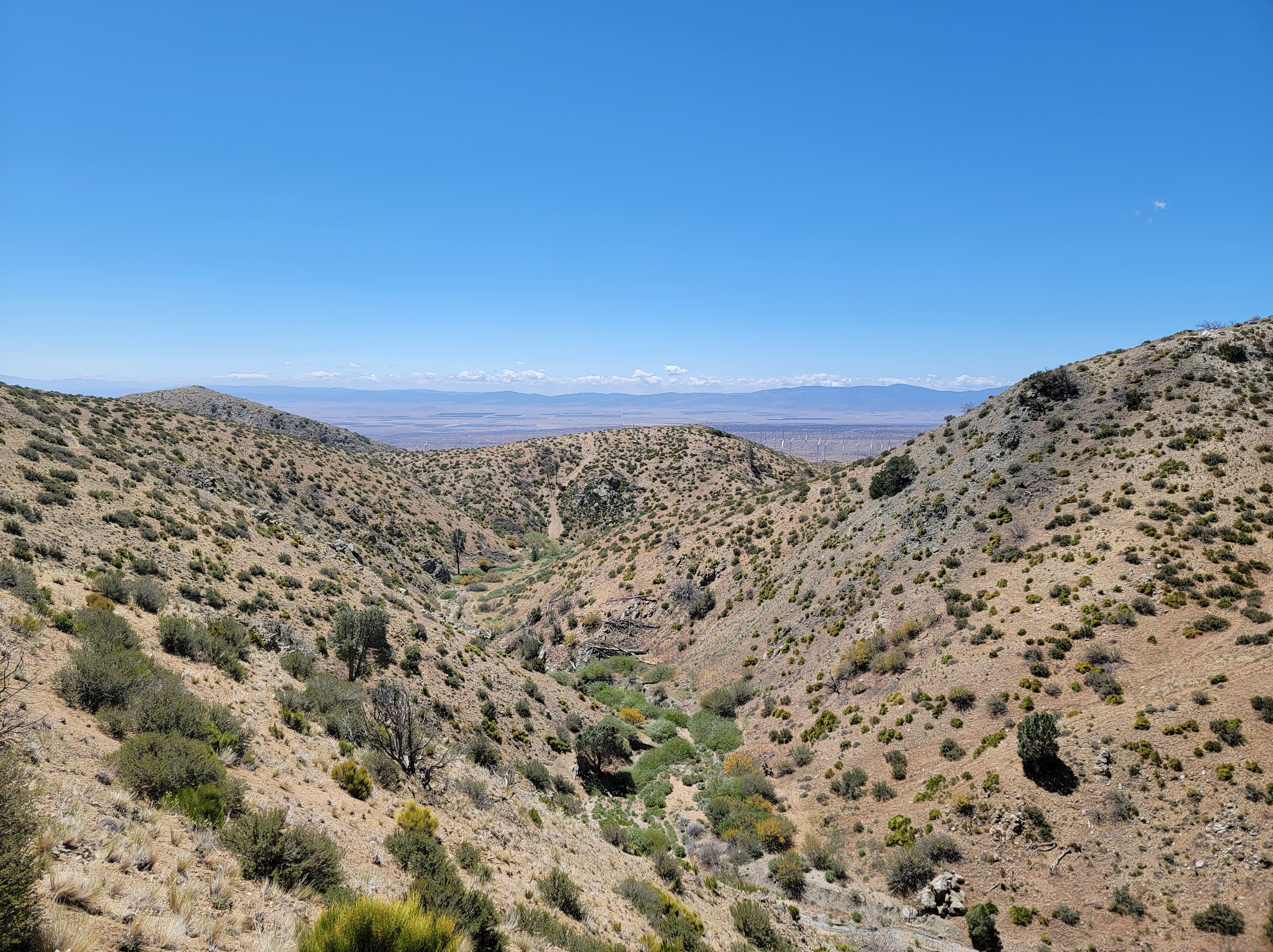 The trail after the break climbs quickly back into the wind, but it’s not quite as bad as before.  We make it to a water source for lunch.  It’s windy, but we’re sheltered enough in a valley that it’s a pleasant break.  The next few miles go by quickly, and we take another break before the big climb that is supposed to lead to sheltered campsites.  We shelter in a wash during the break and enjoy only light winds while we rest.