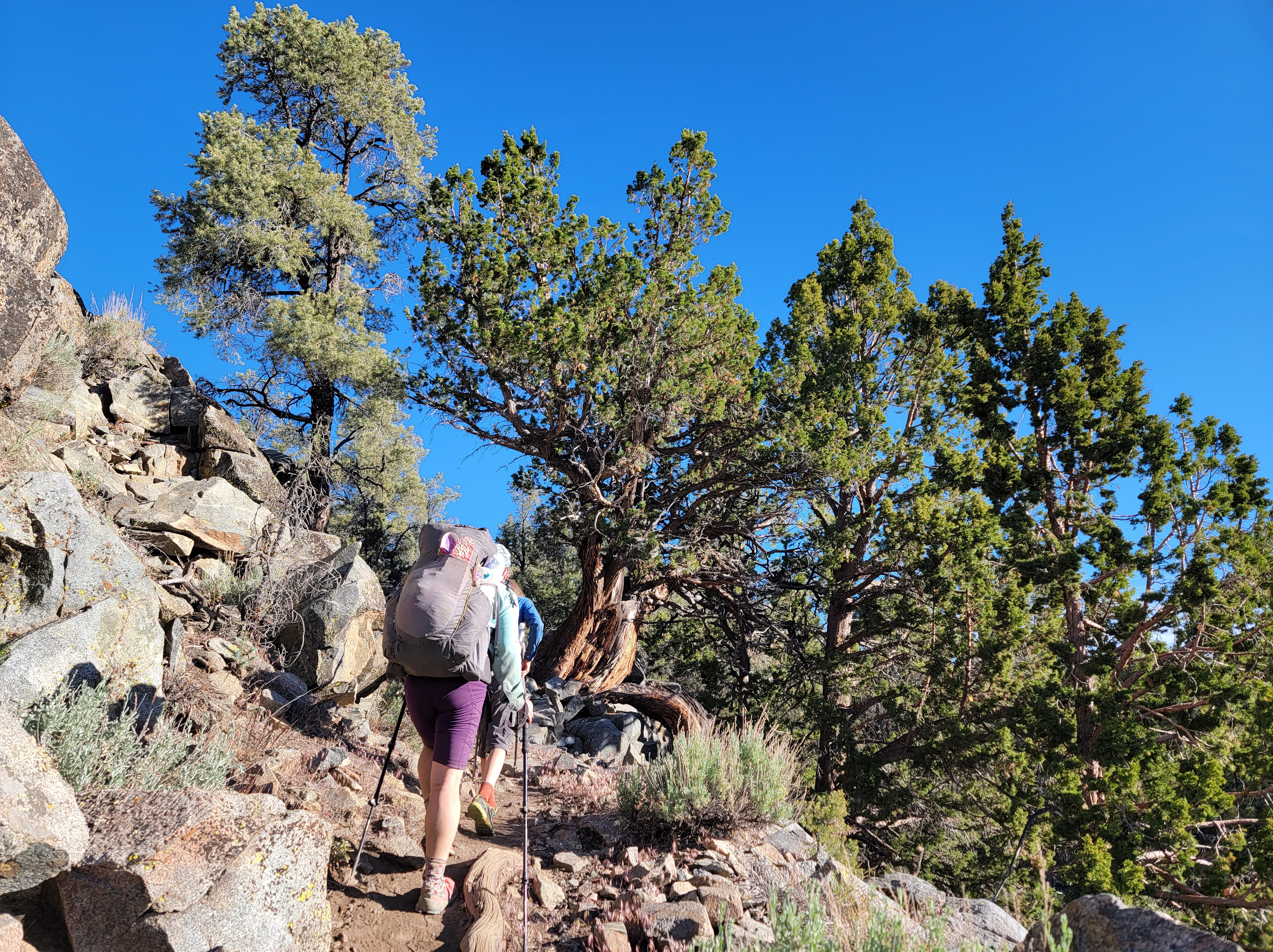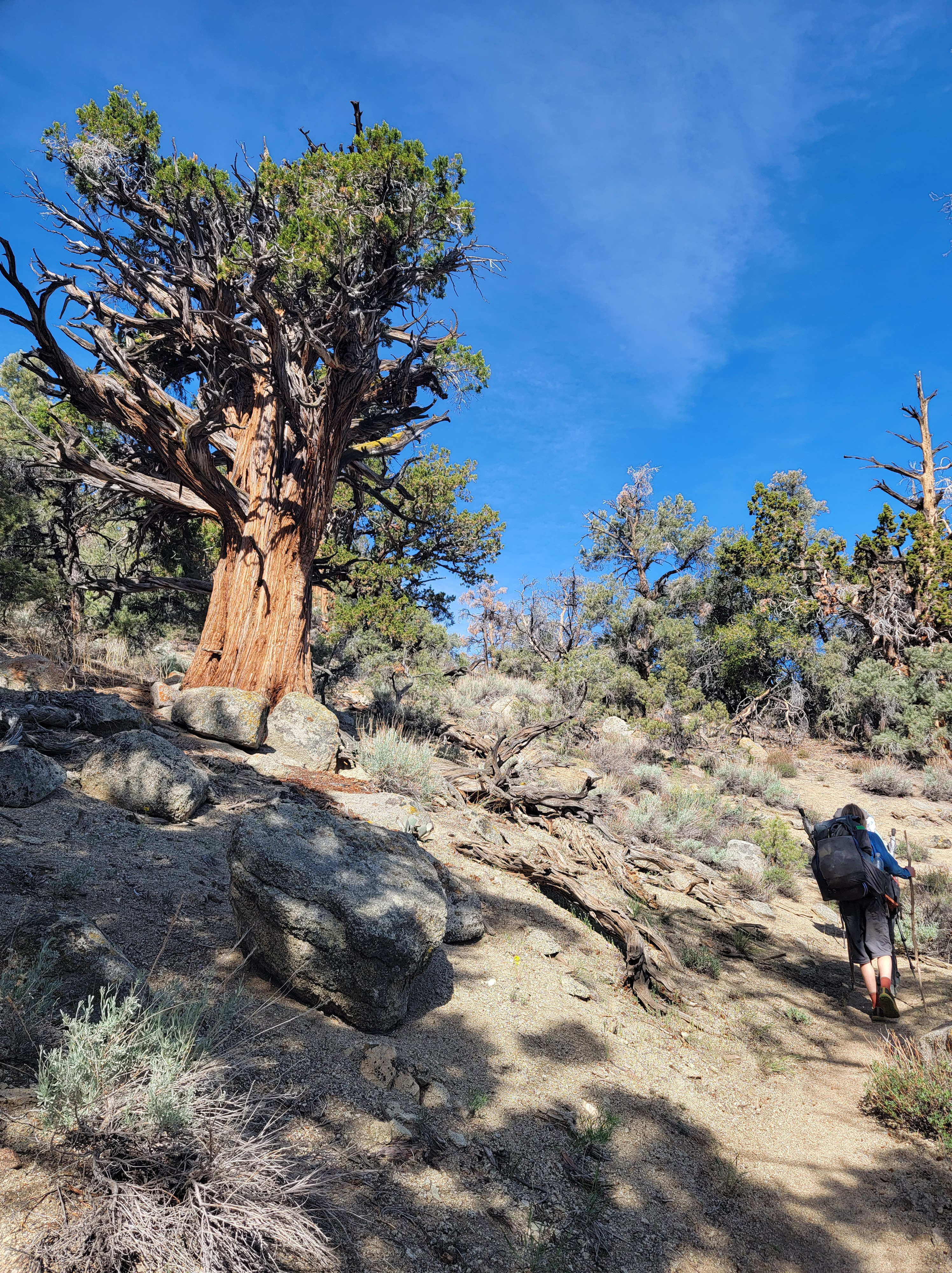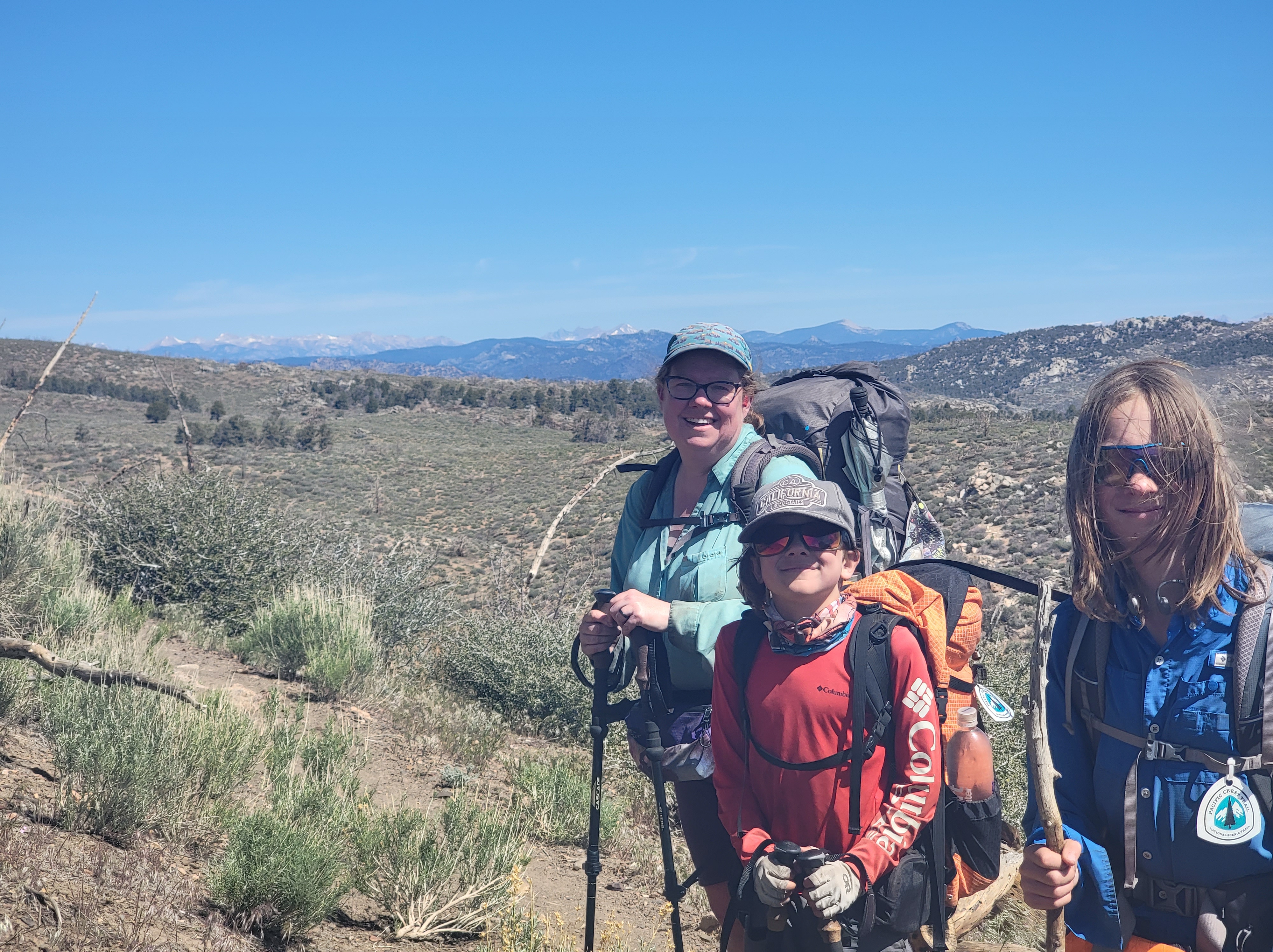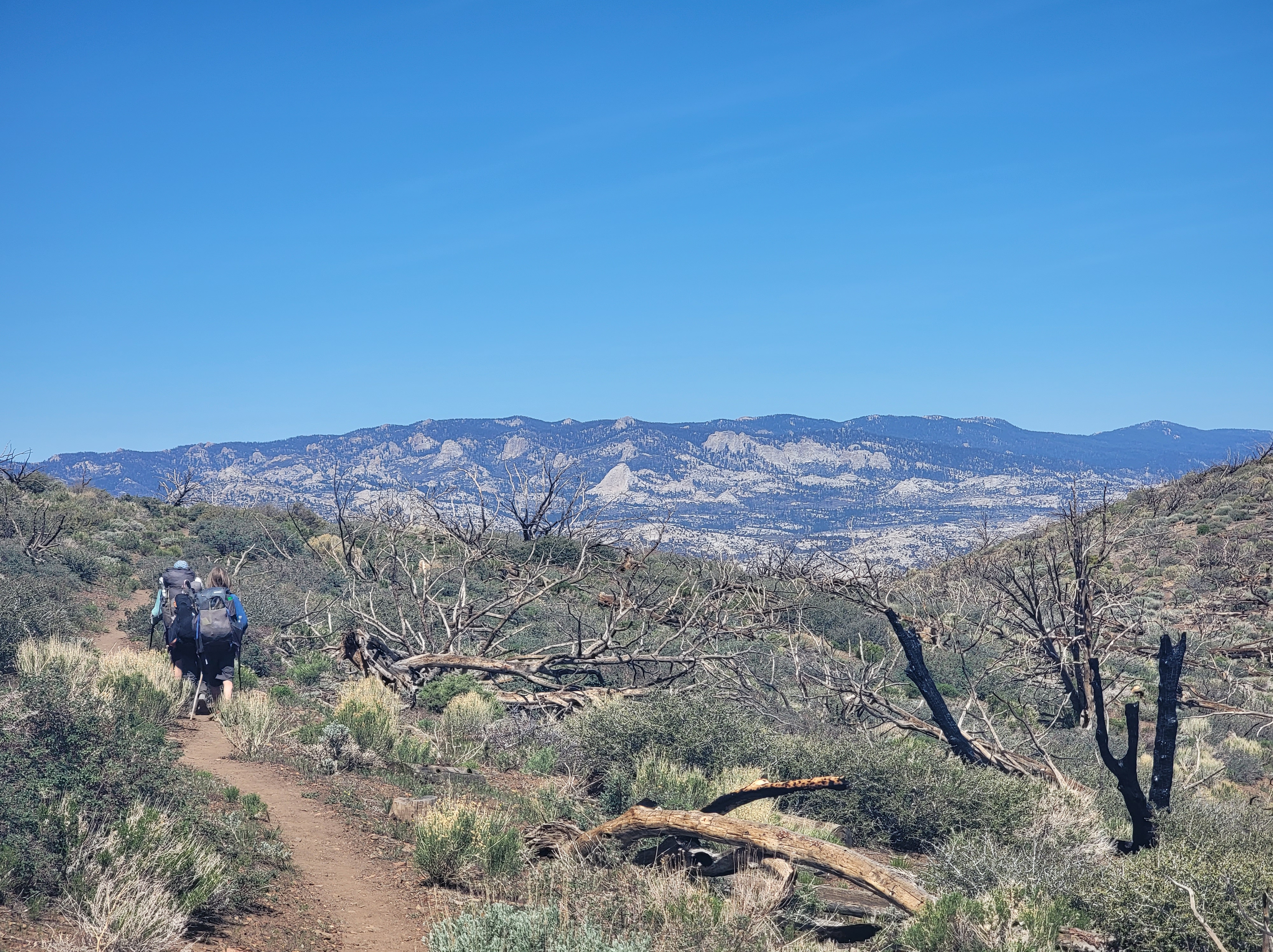 Today was similar to yesterday. We got up and tackled the climb early, getting to the top we’ll before noon. After that it was all downhill through a burn with no shade for several miles. While the view of the burn leaves a lot to be desired, we’re treated to our first good views of the snow-capped Sierra in the distance. We pushed through into the early afternoon hours before stopping at a water source for lunch.