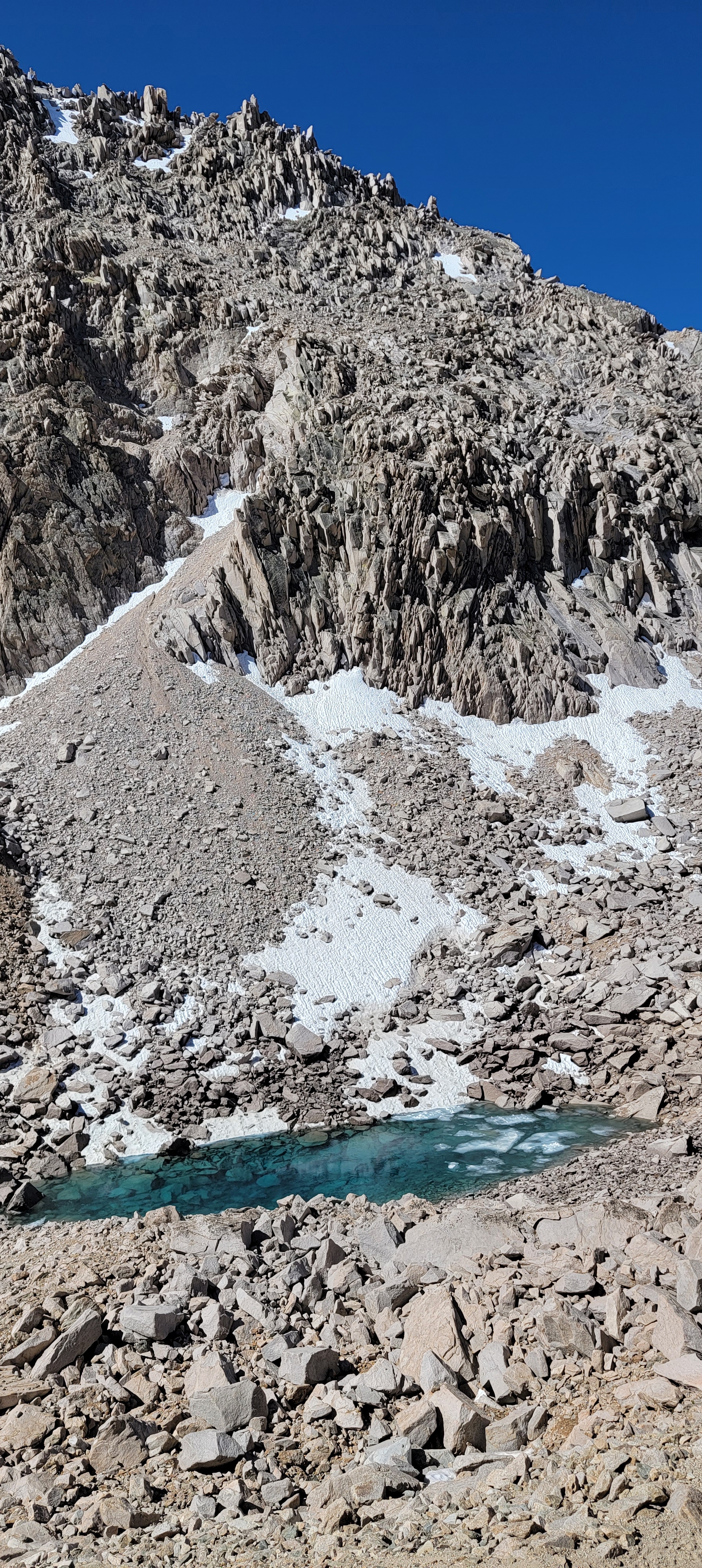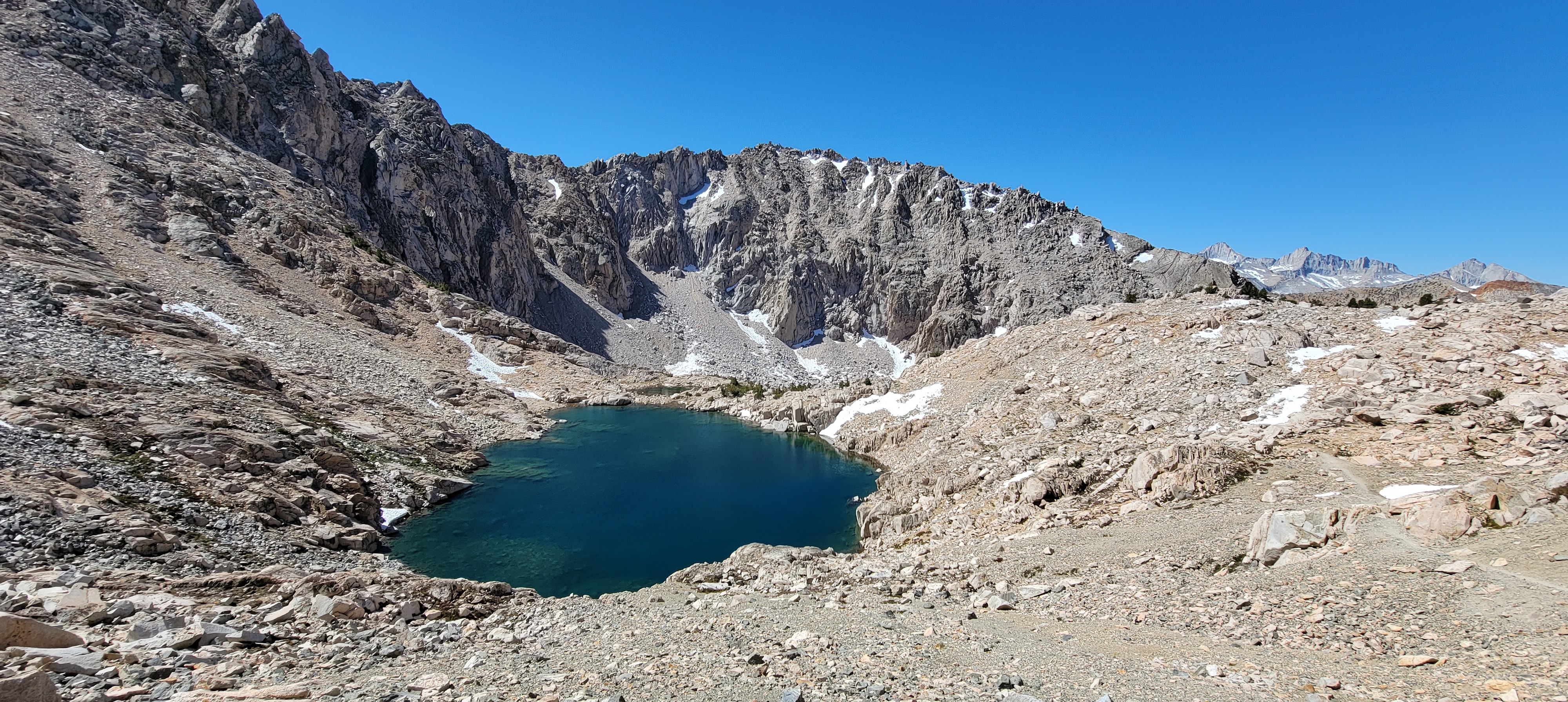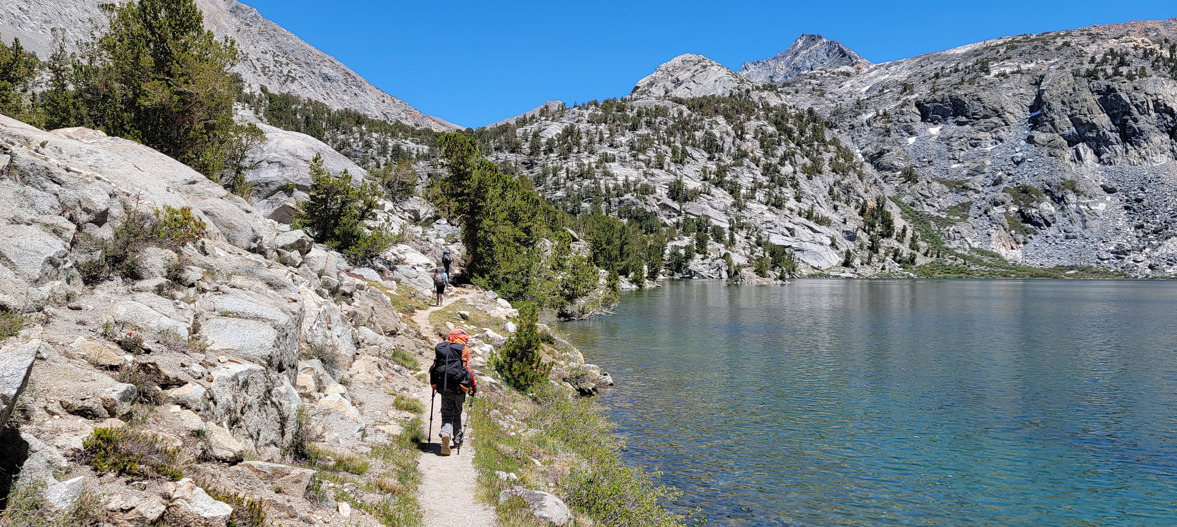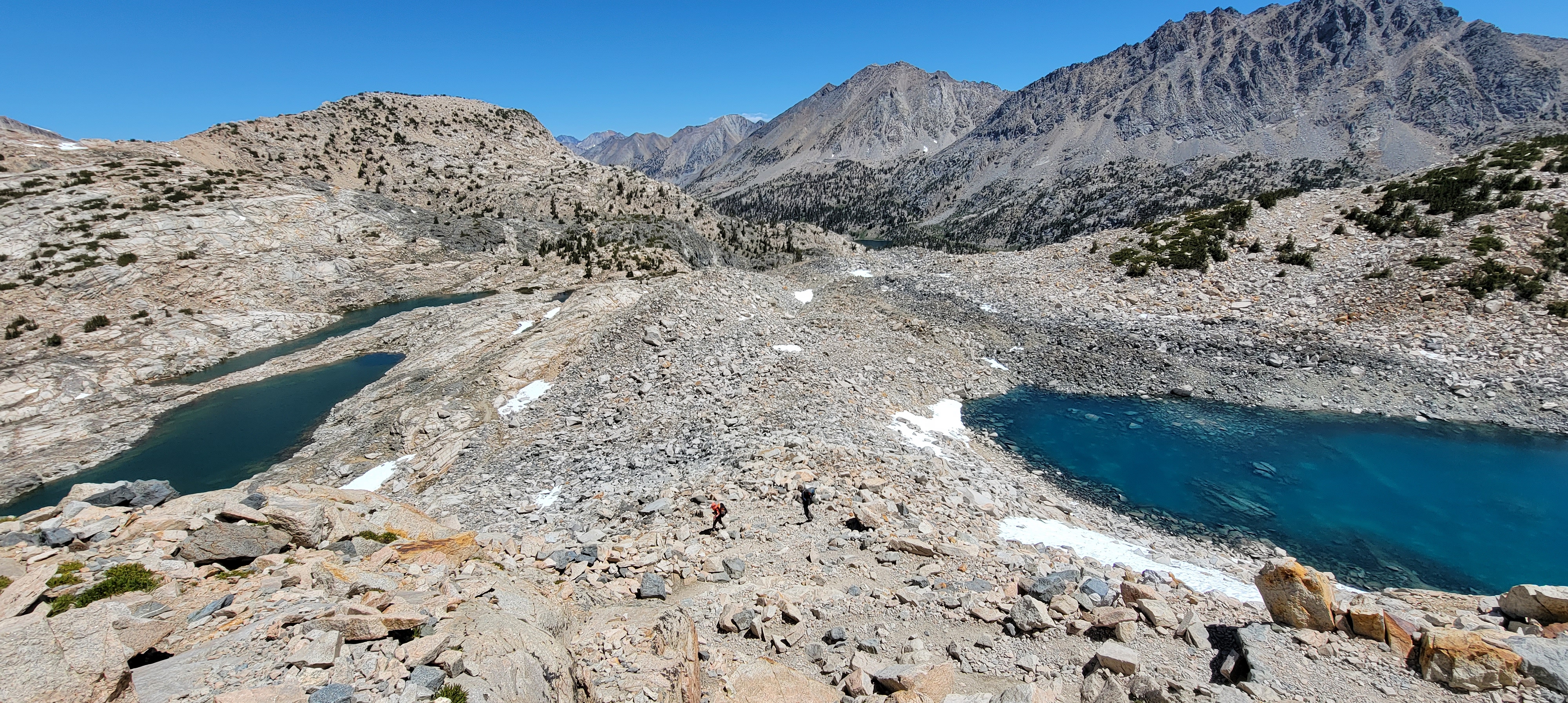 Our decision to wait for snow to melt pays off as we cross no more than 50ft of snow on the descent.  However, the descent is full of steep rocky steps which do not agree with Blue Lizard’s knees.  The first 2 miles of descent goes slower than the climb and we don’t make it to the first lake until lunch.  We take a long lunch/ fishing break and catch fish after fish after fish.