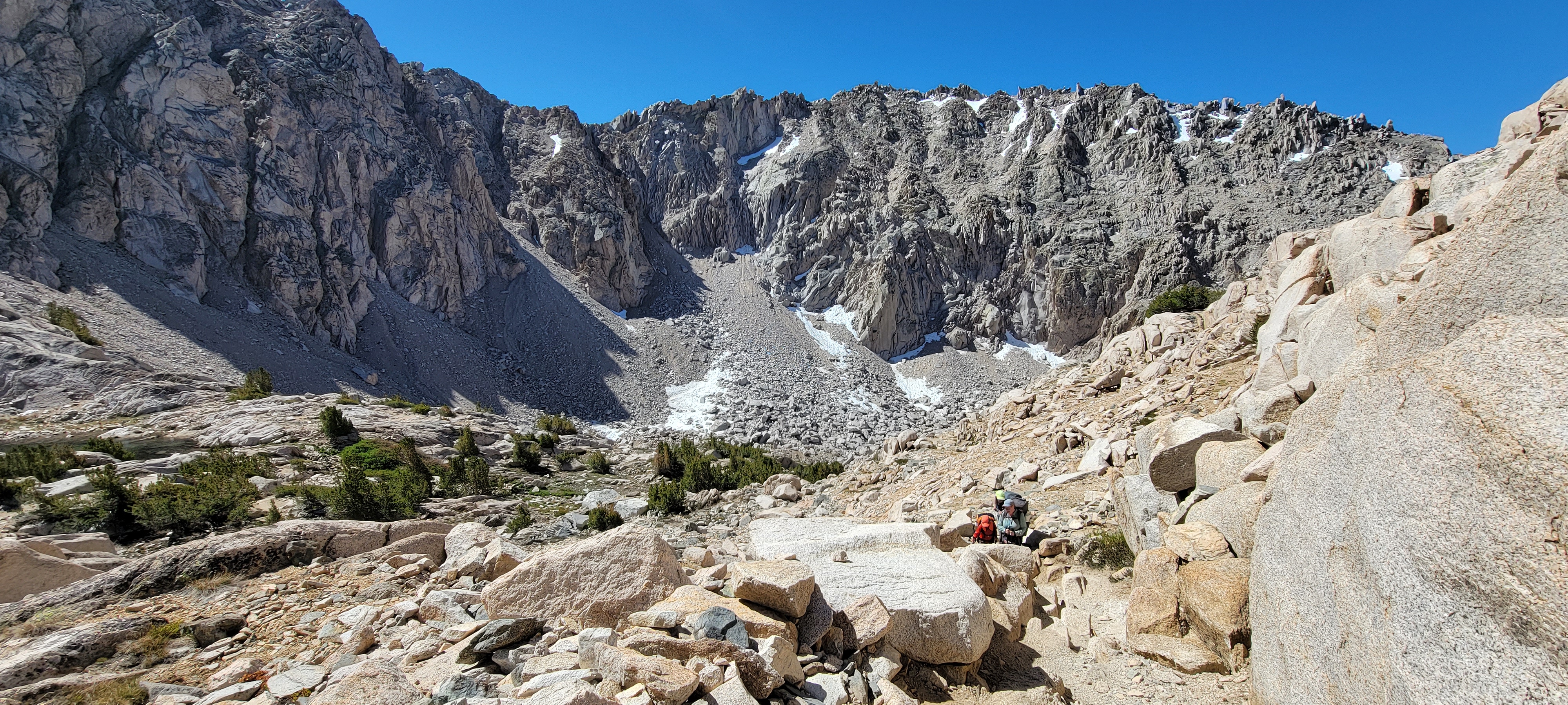 The trail from camp leads steeply up to Glen Pass over the next mile.  We climb slowly, still not fully acclimated to being above 10,000 feet again, and reach the top an hour later.  The view from the top looks down into the beautiful Rae Lakes which we’ll hike through on the way down.