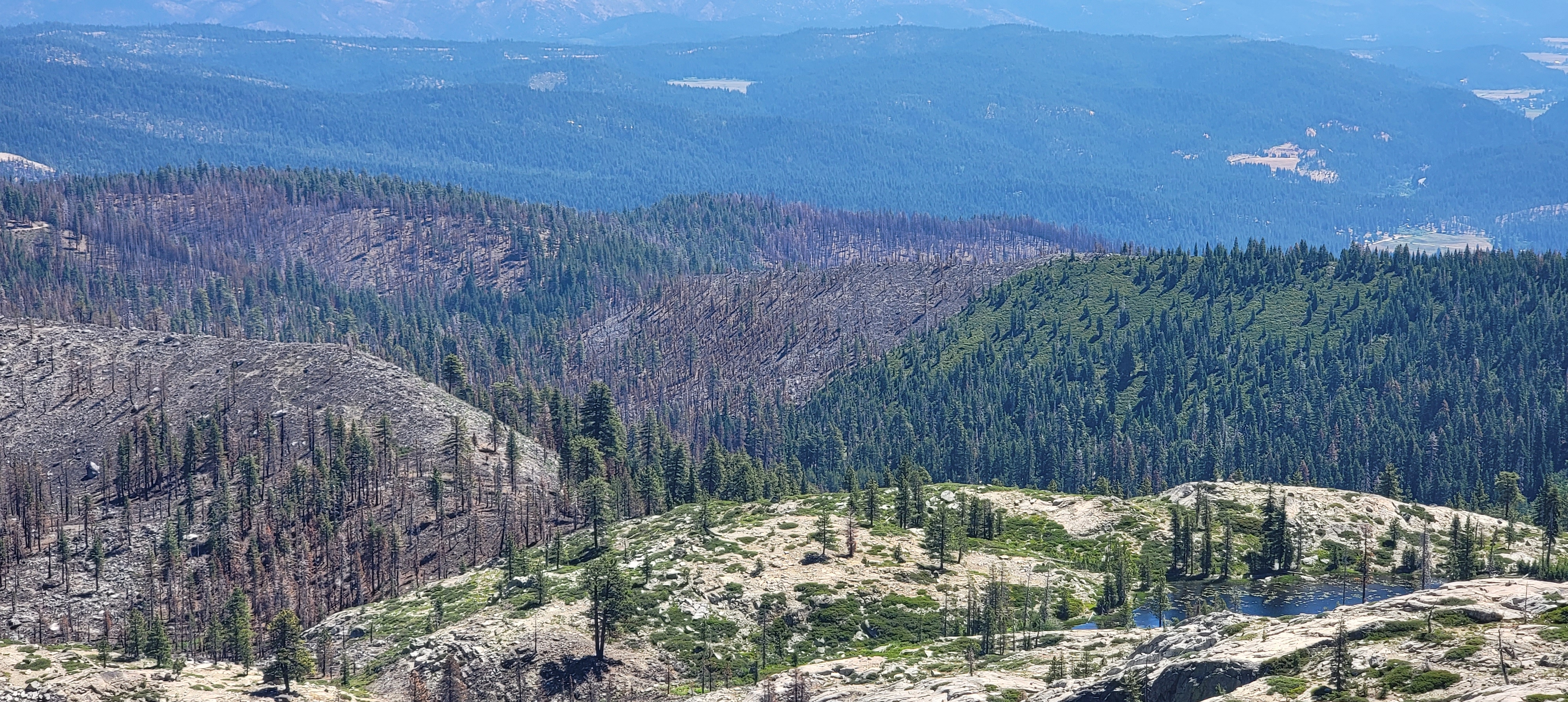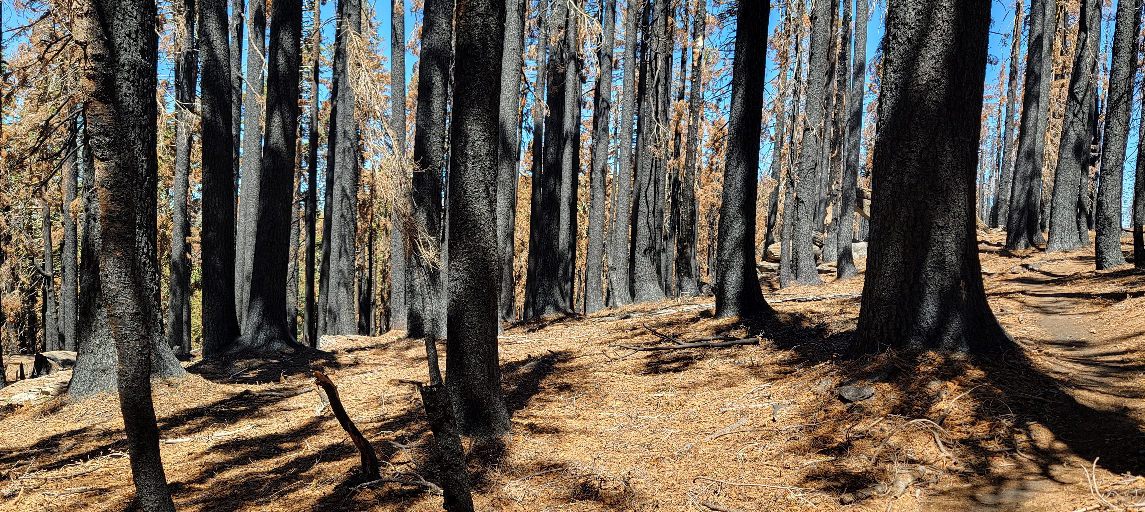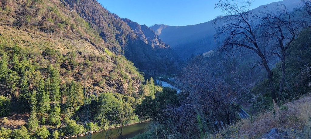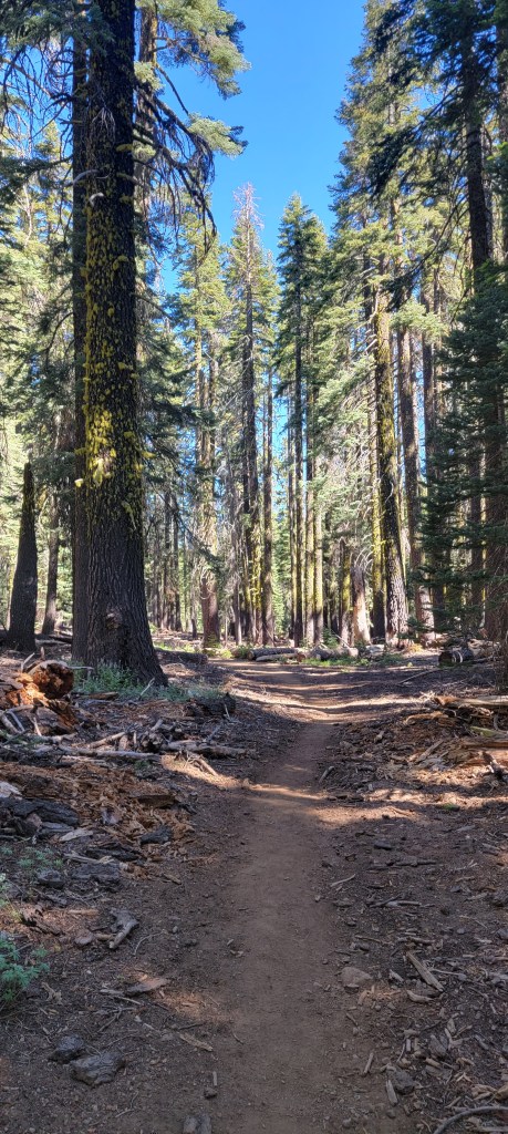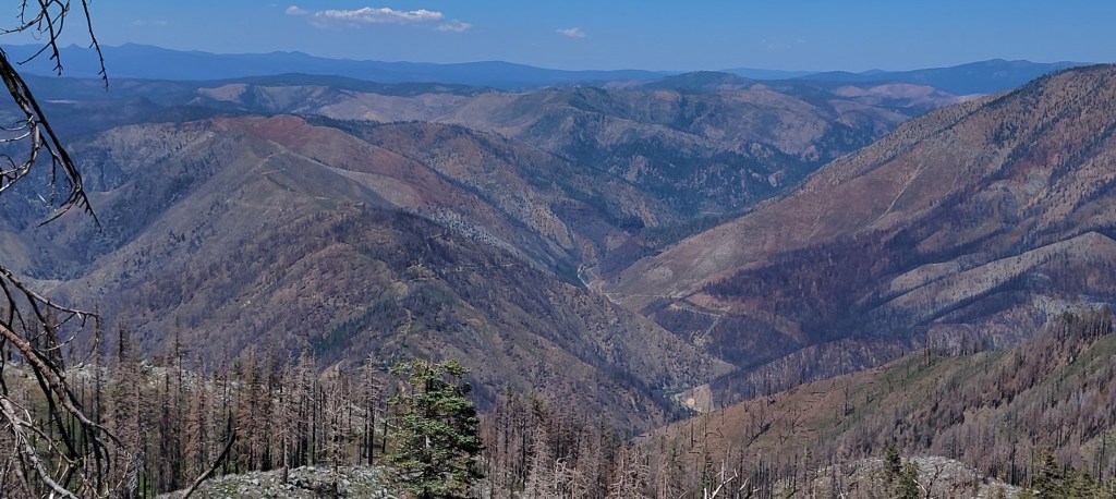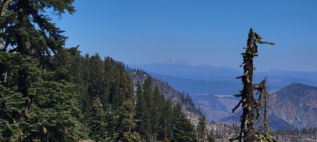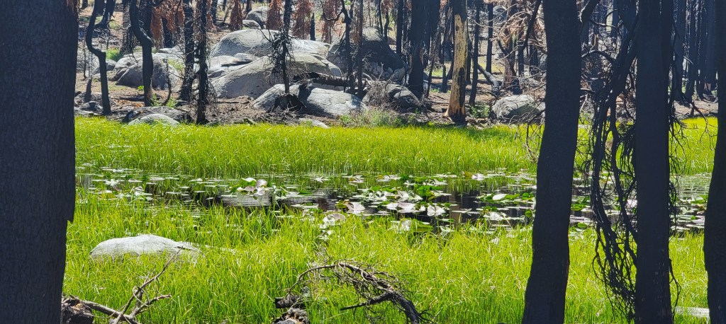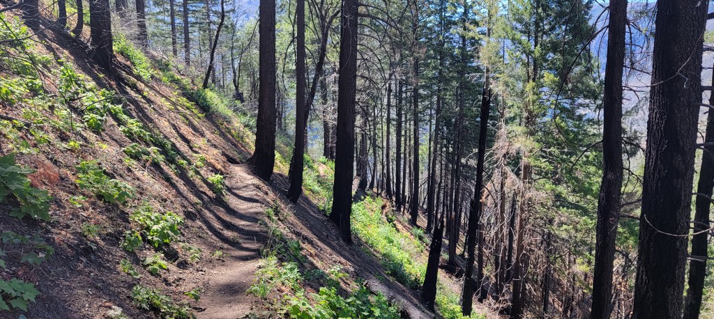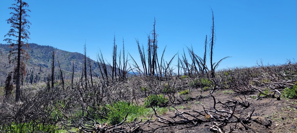 I was on trail around 7am and flew through the first several miles of rolling hills. I had another decent climb after this and soon entered the burn scar from last year’s Dixie Fire. As a whole it wasn’t as bad as I thought it would be, but there were large sections where there were no living plants. There were also areas with dead, burnt trees and living flowers and ferns.