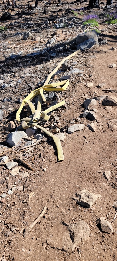 The trail gets less rocky further up, and actually has some unburnt trees. I’m still hiking through the burn but it hasn’t been all that bad…yet. Once at the top of the hill I’m greeted to views of Mt. Lassen in the distance and swaths of burned trees in the foreground. From here on out the trail surface turns to a very fine mixture of dirt and ash that puffs into dust clouds as I walk. Within a few miles I have a layer of black dirt all the way up to my knees. I’ve accumulated more dirt in a few miles than I did in the entire 32 mile day yesterday. At one point I pass sections of fire hose, some partially burnt, which I assume are there because the fire moved too rapidly to retrieve them. The entire area feels like a battlefield that’s been completely destroyed.