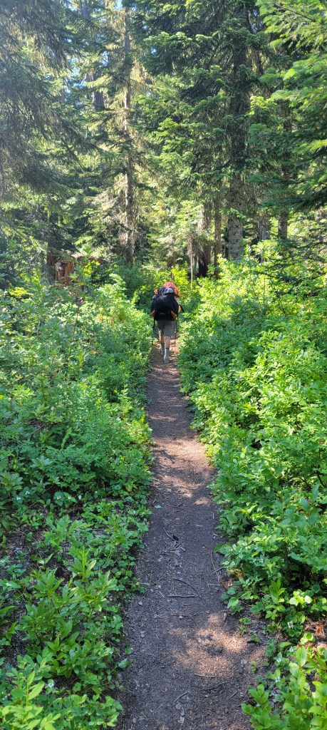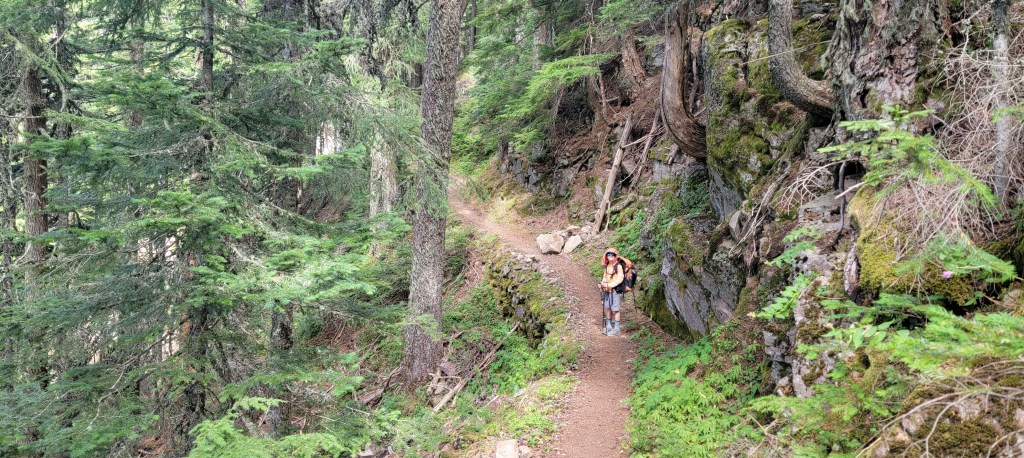 Bat Boy and I headed out on trail today for a planned 55 mile stretch from Frog Lake to Cascade Locks. This is the first of the trips with each of the kids for some 1-on-1 time. Blue Lizard drove us to trail and walked the first half mile with us. The trail was easy today with a mostly smooth dirt surface and reasonable grades. Most of the hike was in dense forests.