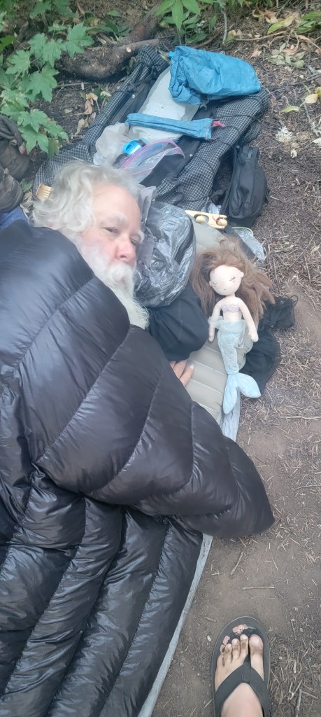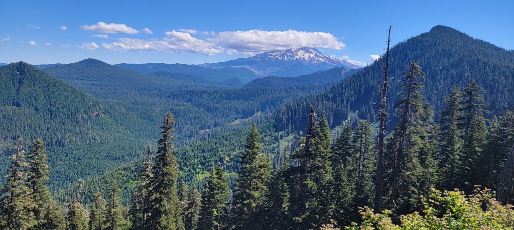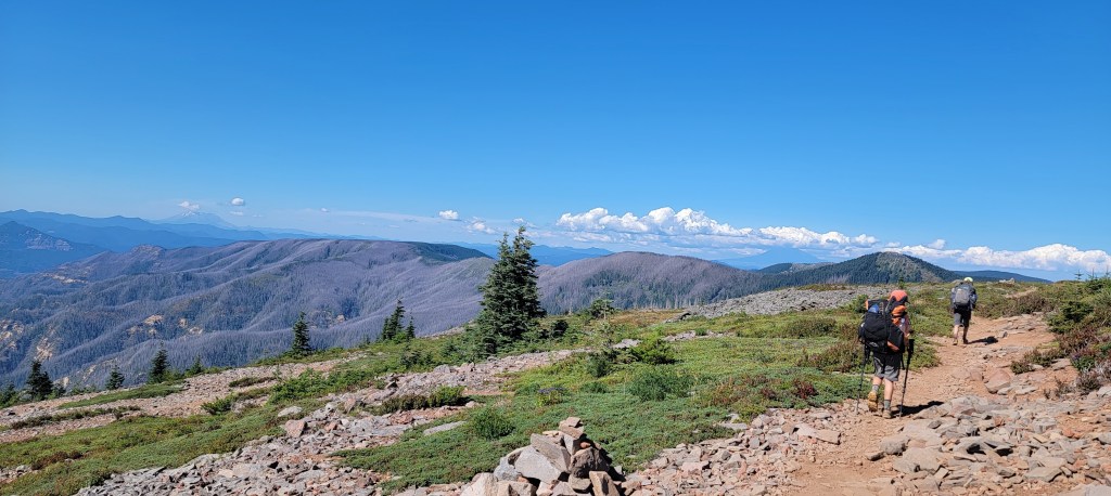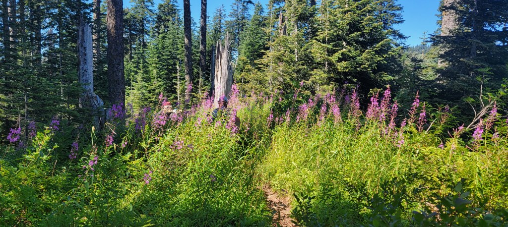 We continued towards Cascade Locks today, covering about 13 miles before stopping at the junction with the Eagle Creek trail we’d be taking out tomorrow. Most of the hike passed through shaded forests with abundant ripe huckleberries lining the trail. There was a stretch of blowdowns we had to navigate mid-day, but other than the that it was an easy hike.