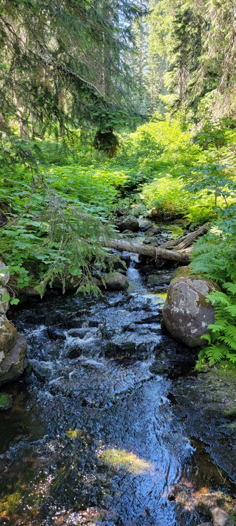 The rest of the miles dragged by as the heat climbed and mosquitoes followed, hoping for a bite. I made it to Walupt Lake around 2pm and quickly found shade near the water to try to cool and rehydrate. Angela picked me up an hour later to put the wraps on this section.