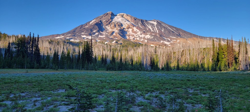 The trail started with about 15 miles of pine forests with smooth trail, large trees, limited views, and tolerable mosquitoes. It was a warm day with highs in the upper 80s, but I had plenty of shade to make it pleasant. Unfortunately, right as I thought the heat was breaking, the trail entered a burn with no shade for miles. On the bright side, the lack of trees provided incredible views of Mt. Adams. I plodded along, eventually getting to camp after 26 miles and more than a mile of climb. I quickly setup camp and jumped in the tent to hide from the mosquitoes that were now out in full force.