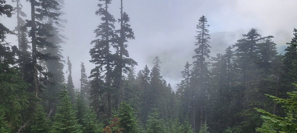 Similar to yesterday, I woke to the sound of rain and took my time getting ready, hoping it would let up before I started. The rain was stubborn, and I wasn’t in too big of a hurry, so I didn’t get on trail until a little after 9 am. Most of the morning was shrouded in clouds and mist, and large stretches of the trail were lined with delicious, ripe, mile-sucking huckleberries.
