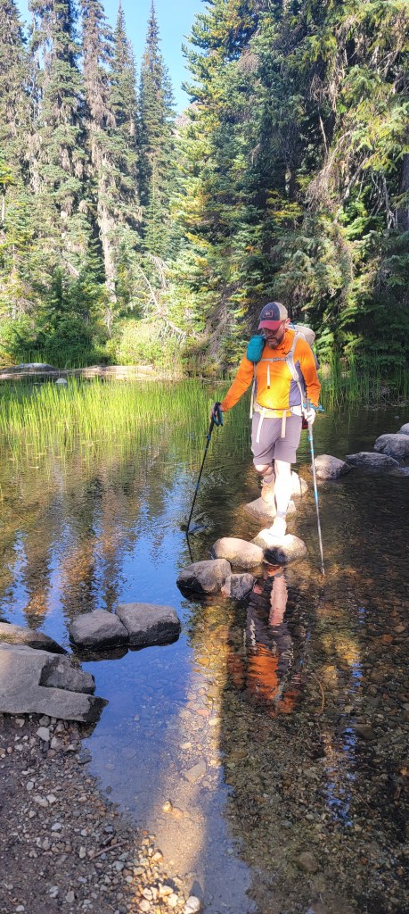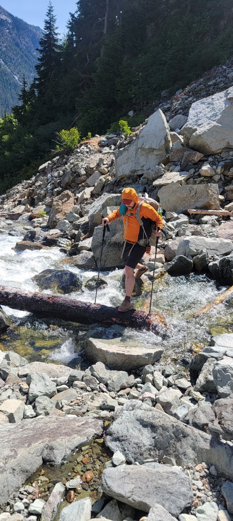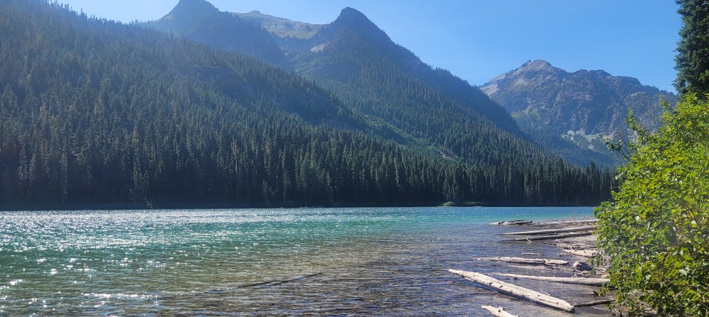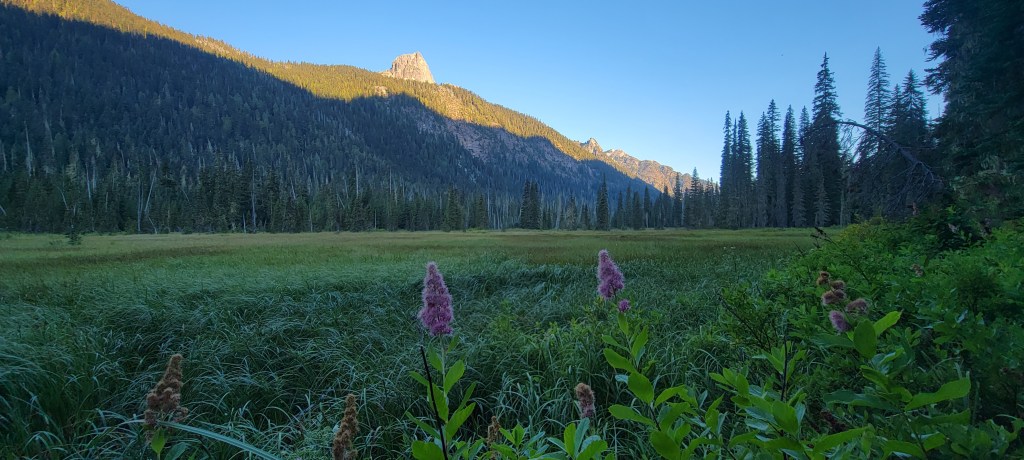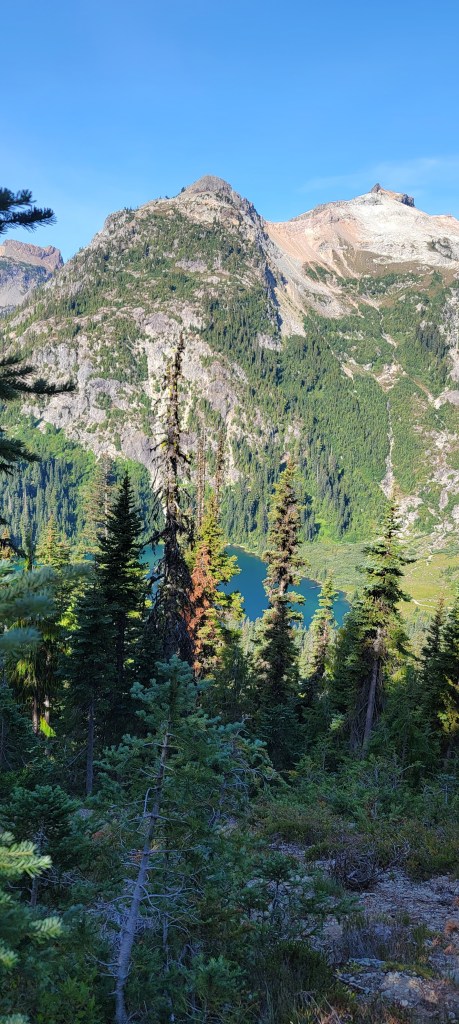 We were up before sunrise and took our time enjoying coffee on the lakeshore. Once we left camp, it was the typical long climb to start the day. Unlike the last 2 days, my knee pain kicked in from the start. Uphills hurt like yesterday’s downhills, and downhills turned into excruciating slow descents. On top of this, Matt had excerpts from a guidebook, which described some of the upcoming descents as “knee jarring,” as if my knee wasn’t already jarred. We got a good laugh out of it, but also realized we should probably find an earlier exit. We were still about 30 miles from Stevens Pass and closer to 20 miles from a shorter route to the highway. That route, of course, was described as a rocky, root covered, poorly engineered trail with steep descents. We instead found an exit on the Deception Pass Trail to Hyas Lake.