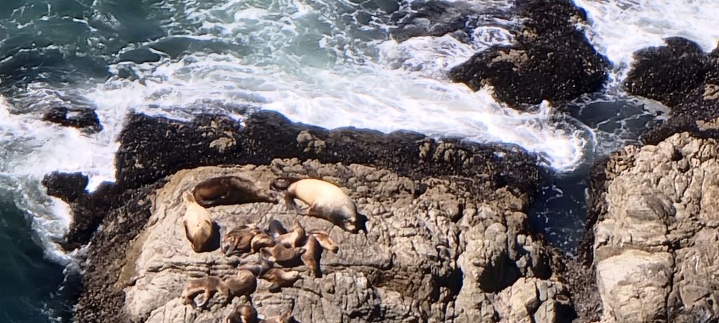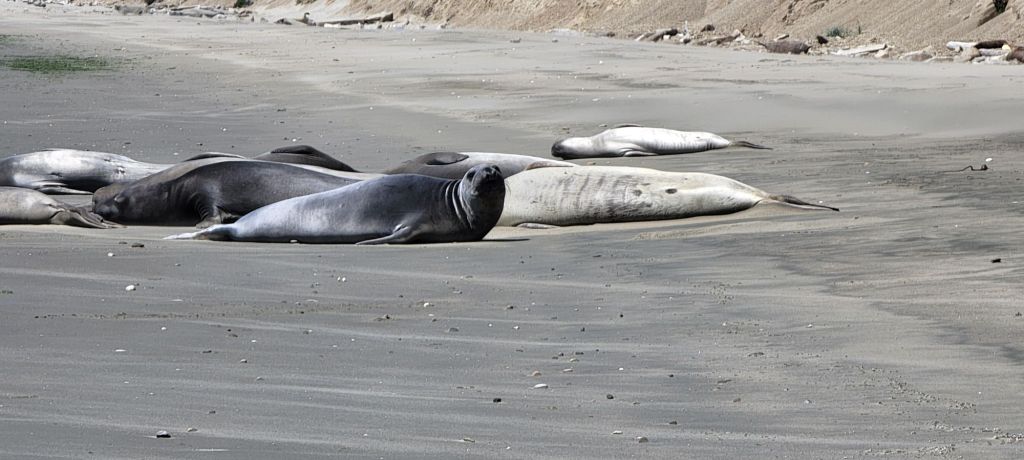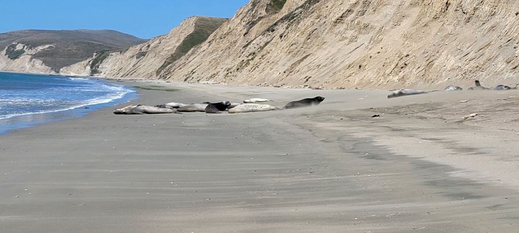 We started off with a visit to Point Reyes National Seashore. This is a park we stopped at very briefly on a previous whirlwind trip of California NPS sites, but we barely made it beyond the visitor center on that one. The route to the park took us over the Golden Gate Bridge. First up at Point Reyes was a short walk to an elephant seal overlook where the seals could be seen swimming or sunning themselves far below the overlook. They were difficult to really see at this distance, so we went for a closer look.